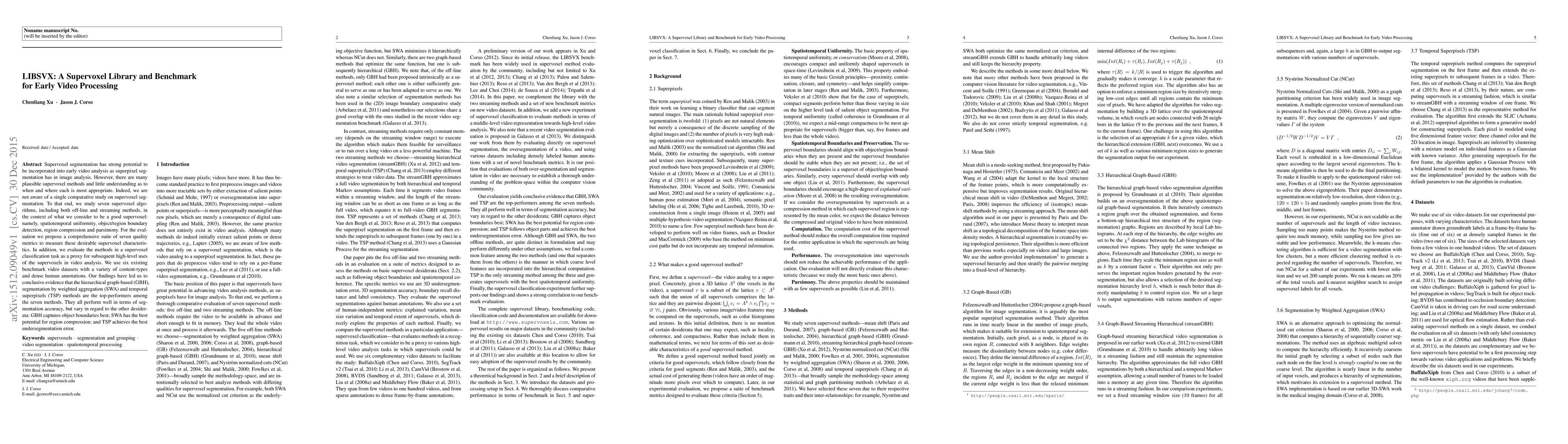 This paper introduces LIBSVX, a comprehensive supervoxel library and benchmark for early video analysis, evaluating seven supervoxel algorithms based on spatiotemporal uniformity, boundary detection, region compression, and parsimony. The study concludes that hierarchical graph-based (GBH), segmentation by weighted aggregation (SWA), and temporal superpixels (TSP) are the top performers, each excelling in different aspects of supervoxel quality.