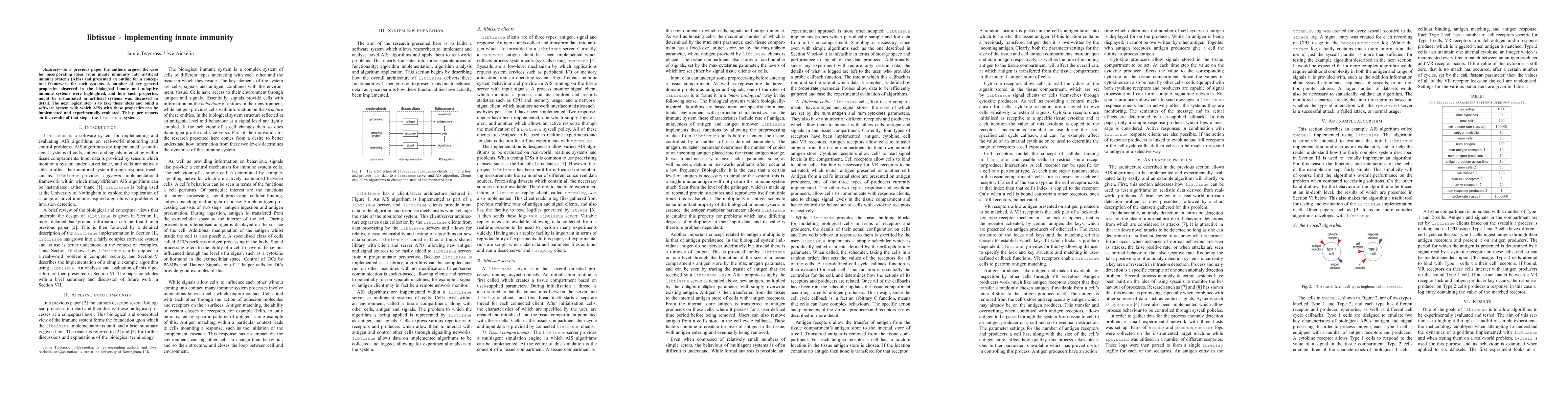 This paper details the development of libtissue, a software system designed to implement artificial immune systems (AISs) incorporating principles from innate immunity. The authors aim to provide a practical framework for experimentally evaluating AISs with properties inspired by biological immune systems.
