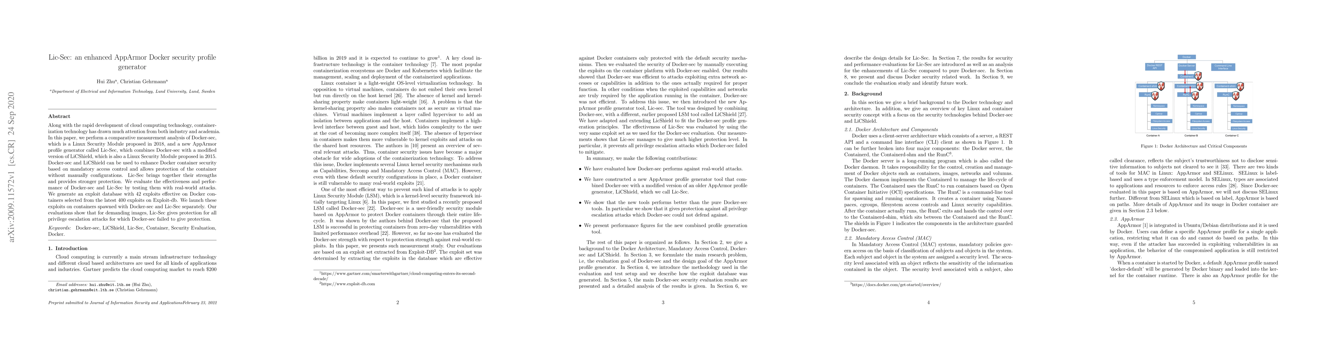 This paper compares Docker-sec and Lic-Sec, a new AppArmor profile generator combining Docker-sec with a modified LiCShield, to enhance Docker container security. Lic-Sec demonstrates stronger protection against privilege escalation attacks compared to Docker-sec, as shown through testing with real-world exploits.
