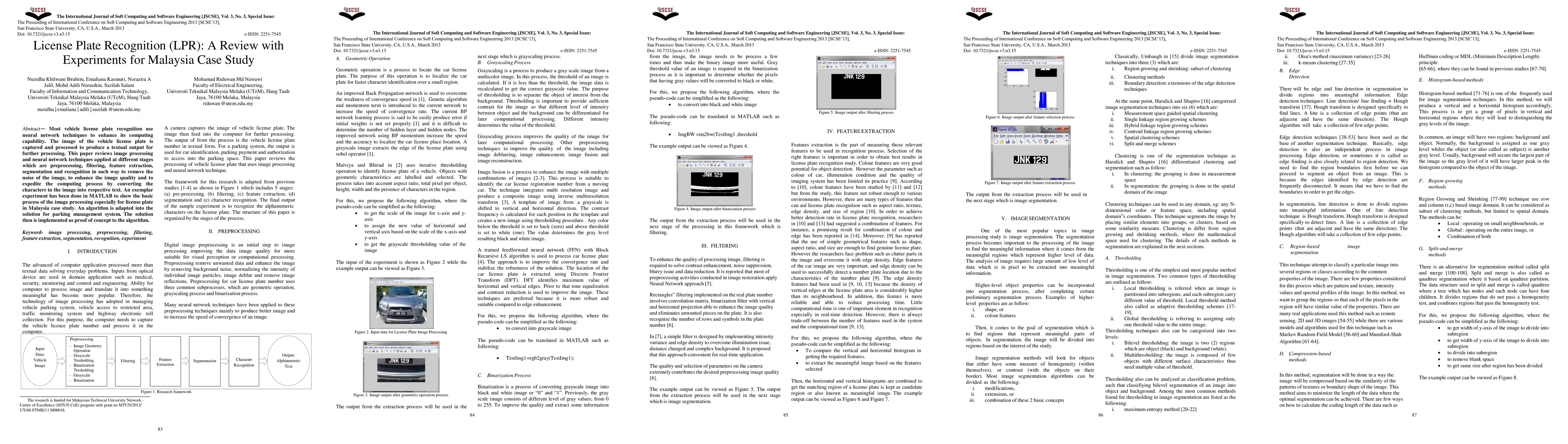 Most vehicle license plate recognition use neural network techniques to enhance its computing capability. The image of the vehicle license plate is captured and processed to produce a textual output for further processing. This paper reviews image processing and neural network techniques applied at different stages which are preprocessing, filtering, feature extraction, segmentation and recognition in such way to remove the noise of the image, to enhance the image quality and to expedite the computing process by converting the characters in the image into respective text. An exemplar experiment has been done in MATLAB to show the basic process of the image processing especially for license plate in Malaysia case study. An algorithm is adapted into the solution for parking management system. The solution then is implemented as proof of concept to the algorithm.