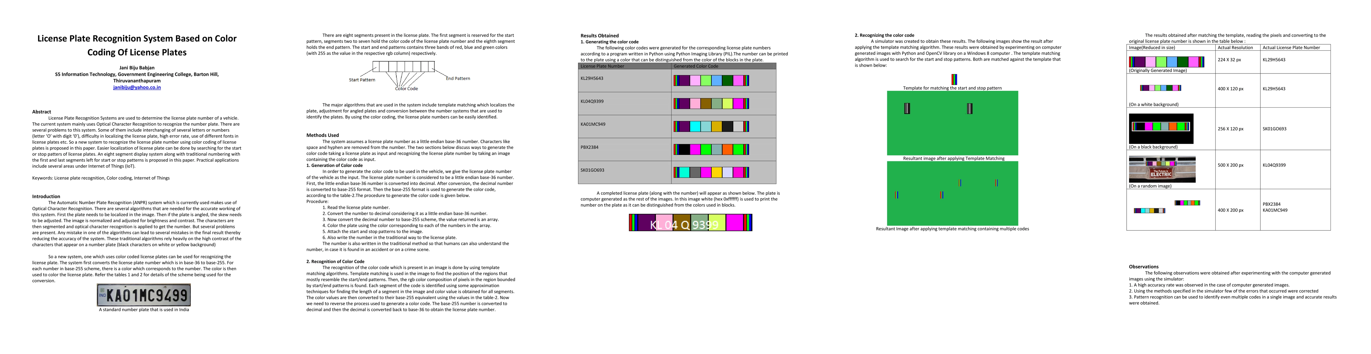 This paper proposes a License Plate Recognition System using color coding to address issues with current Optical Character Recognition systems, including letter-digit confusion and high error rates. The new system employs an eight-segment display with color-coded start/stop patterns for easier localization and integration with IoT applications.