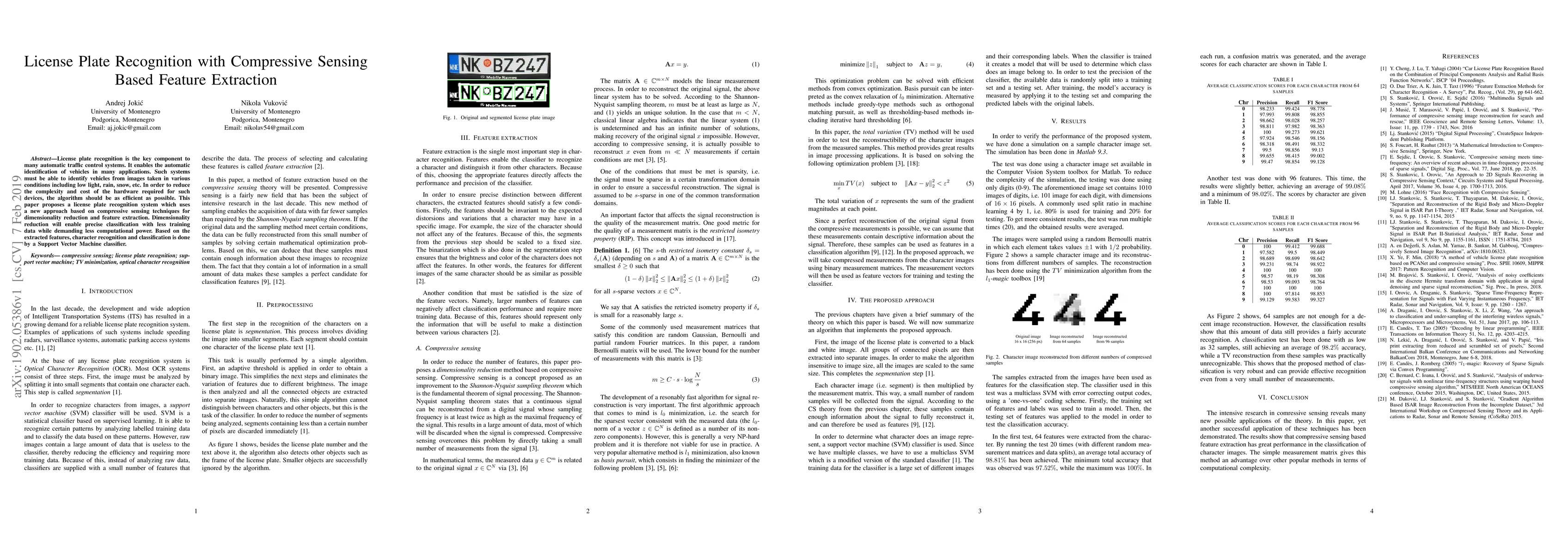 A new license plate recognition system uses compressive sensing for efficient feature extraction, reducing complexity and computational power. The system achieves precise classification with less training data.