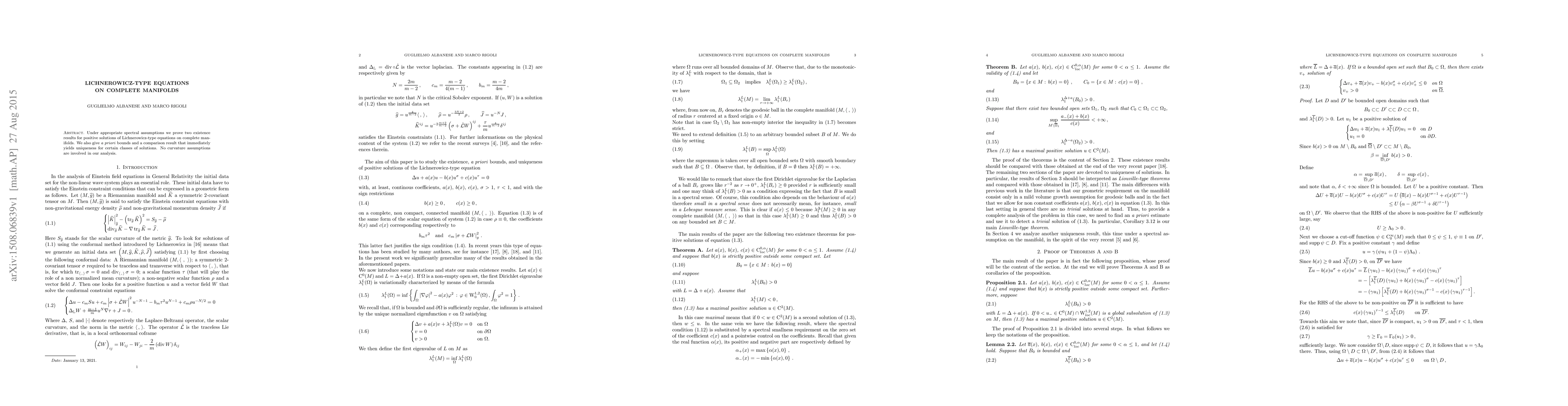 Researchers prove existence of positive solutions to Lichnerowicz-type equations on complete manifolds without curvature assumptions, yielding a priori bounds and uniqueness results for certain classes of solutions.