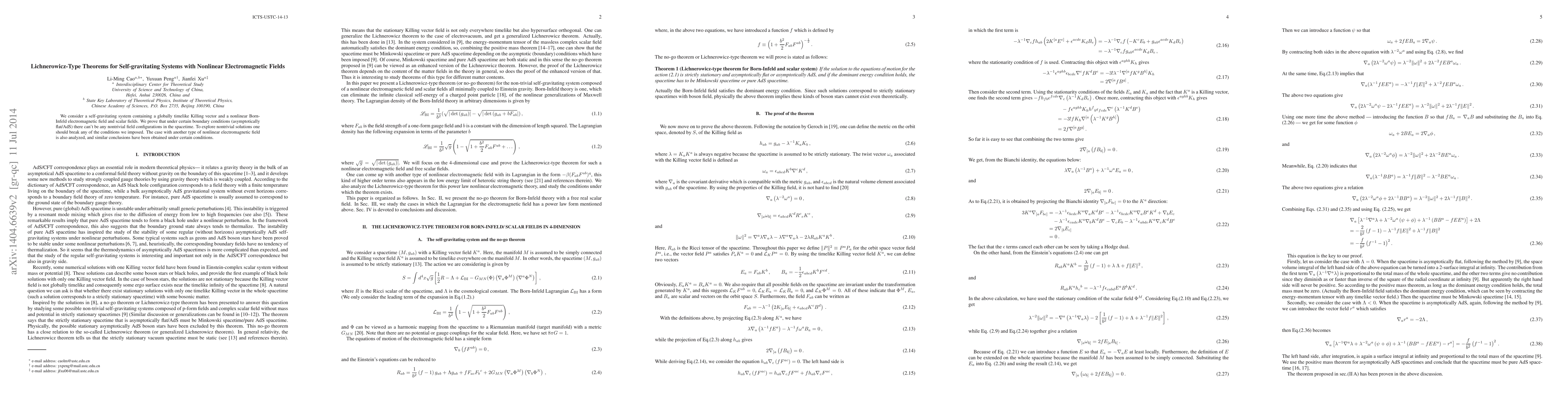 This paper proves that under asymptotically flat or AdS boundary conditions, self-gravitating systems with a globally timelike Killing vector and nonlinear Born-Infeld electromagnetic fields cannot support nontrivial field configurations. To find nontrivial solutions, these boundary conditions must be violated. Similar results are obtained for another type of nonlinear electromagnetic field under certain conditions.