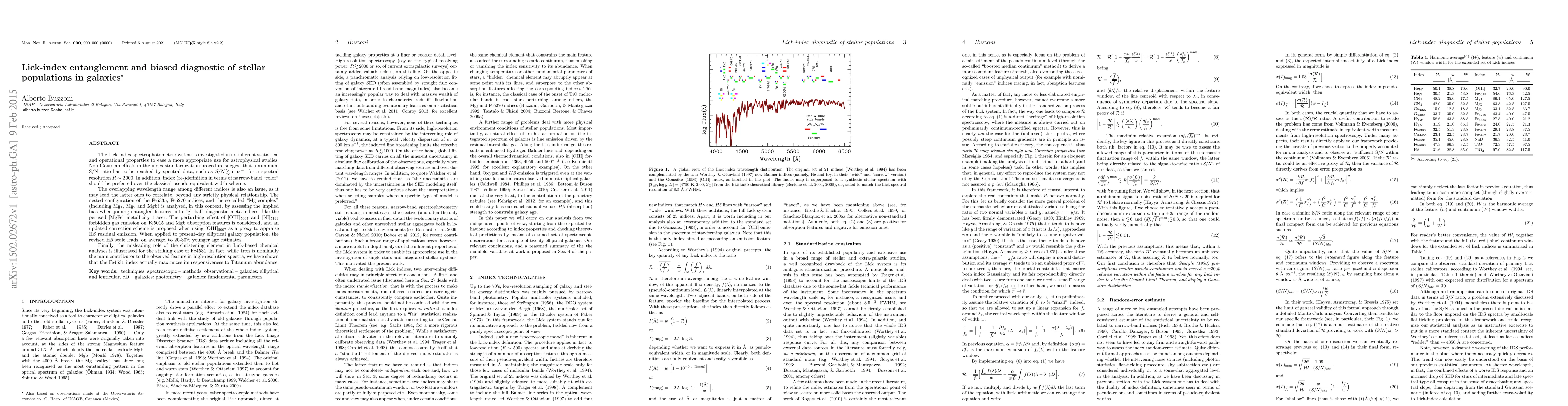 The Lick-index spectrophotometric system is investigated in its inherent statistical and operational properties to ease a more appropriate use for astrophysical studies. Non-Gaussian effects in the index standardization procedure suggest that a minimum S/N ratio has to be reached by spectral data, such as S/N >= 5 px^{-1} for a spectral resolution R~2000. In addition, index (re-)definition in terms of narrow-band "color" should be preferred over the classical pseudo-equivalent width scheme. The overlapping wavelength range among different indices is also an issue, as it may lead the latter ones to correlate, beyond any strictly physical relationship. The nested configuration of the Fe5335, Fe5270 indices, and the so-called "Mg complex" (including Mg1, Mg2 and Mgb) is analysed, in this context, by assessing the implied bias when joining entangled features into "global" diagnostic meta-indices, like the perused [MgFe] metallicity tracer. The perturbing effect of [OIII](5007) and [NI](5199) forbidden gas emission on Fe5015 and Mgb absorption features is considered, and an updated correction scheme is proposed when using [OIII](5007) as a proxy to appraise Hbeta residual emission. When applied to present-day elliptical galaxy population, the revised Hbeta scale leads, on average, to 20-30% younger age estimates. Finally, the misleading role of the christening element in Lick-based chemical analyses is illustrated for the striking case of Fe4531. In fact, while Iron is nominally the main contributor to the observed feature in high-resolution spectra, we have shown that the Fe4531 index actually maximizes its responsiveness to Titanium abundance.