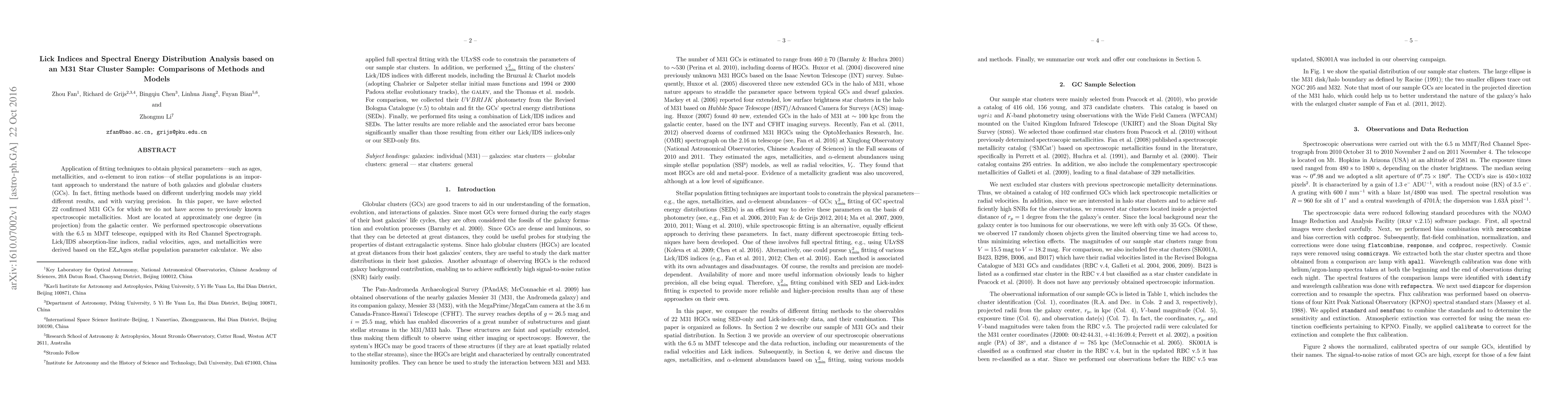 Application of fitting techniques to obtain physical parameters---such as ages, metallicities, and $\alpha$-element to iron ratios---of stellar populations is an important approach to understand the nature of both galaxies and globular clusters (GCs). In fact, fitting methods based on different underlying models may yield different results, and with varying precision. In this paper, we have selected 22 confirmed M31 GCs for which we do not have access to previously known spectroscopic metallicities. Most are located at approximately one degree (in projection) from the galactic center. We performed spectroscopic observations with the 6.5 m MMT telescope, equipped with its Red Channel Spectrograph. Lick/IDS absorption-line indices, radial velocities, ages, and metallicities were derived based on the $\rm EZ\_Ages$ stellar population parameter calculator. We also applied full spectral fitting with the ULySS code to constrain the parameters of our sample star clusters. In addition, we performed $\chi^2_{\rm min}$ fitting of the clusters' Lick/IDS indices with different models, including the Bruzual & Charlot models (adopting Chabrier or Salpeter stellar initial mass functions and 1994 or 2000 Padova stellar evolutionary tracks), the GALEV, and the Thomas et al. models. For comparison, we collected their $UVBRIJK$ photometry from the Revised Bologna Catalogue (v.5) to obtain and fit the GCs' spectral energy distributions (SEDs). Finally, we performed fits using a combination of Lick/IDS indices and SEDs. The latter results are more reliable and the associated error bars become significantly smaller than those resulting from either our Lick/IDS indices-only or our SED-only fits.