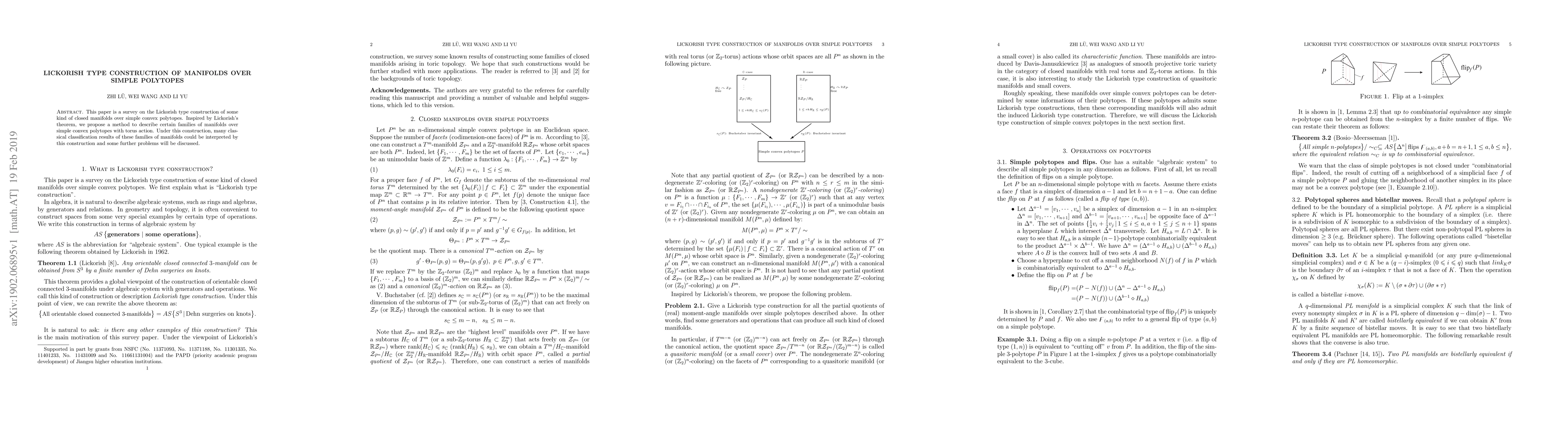 This paper surveys Lickorish-type constructions for closed manifolds over simple convex polytopes, proposing a method to describe families of such manifolds with torus action and interpreting classical classification results through this framework. Further problems and implications of this construction are also discussed.