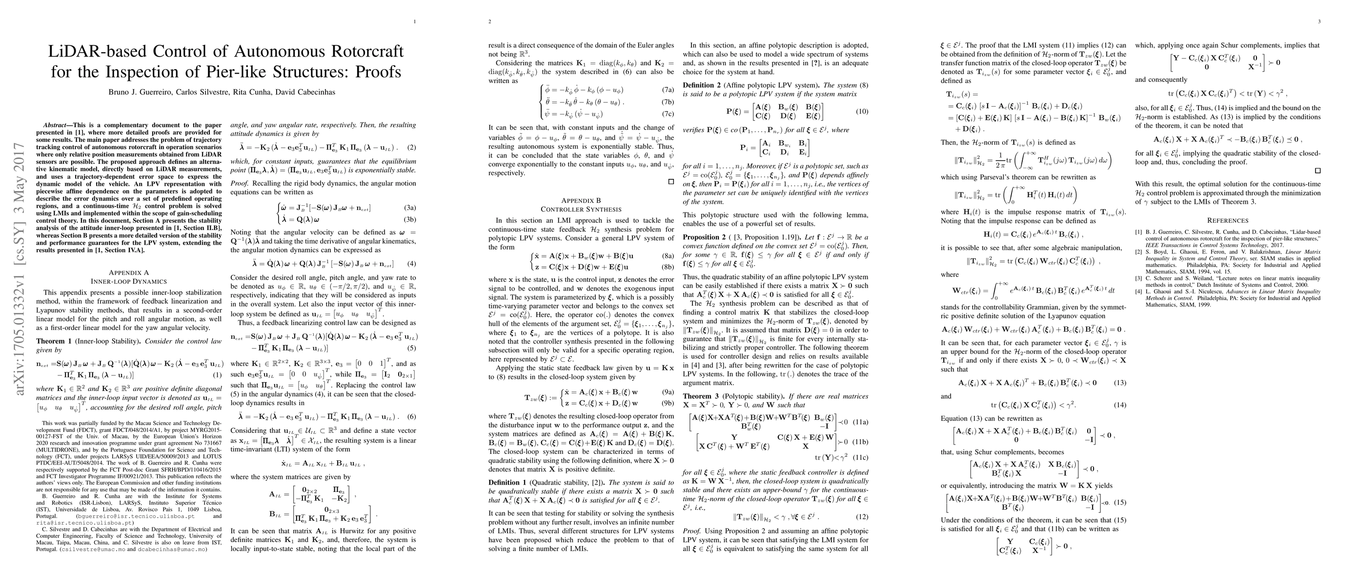 This is a complementary document to the paper presented in [1], to provide more detailed proofs for some results. The main paper addresses the problem of trajectory tracking control of autonomous rotorcraft in operation scenarios where only relative position measurements obtained from LiDAR sensors are possible. The proposed approach defines an alternative kinematic model, directly based on LiDAR measurements, and uses a trajectory-dependent error space to express the dynamic model of the vehicle. An LPV representation with piecewise affine dependence on the parameters is adopted to describe the error dynamics over a set of predefined operating regions, and a continuous-time $H_2$ control problem is solved using LMIs and implemented within the scope of gain-scheduling control theory.