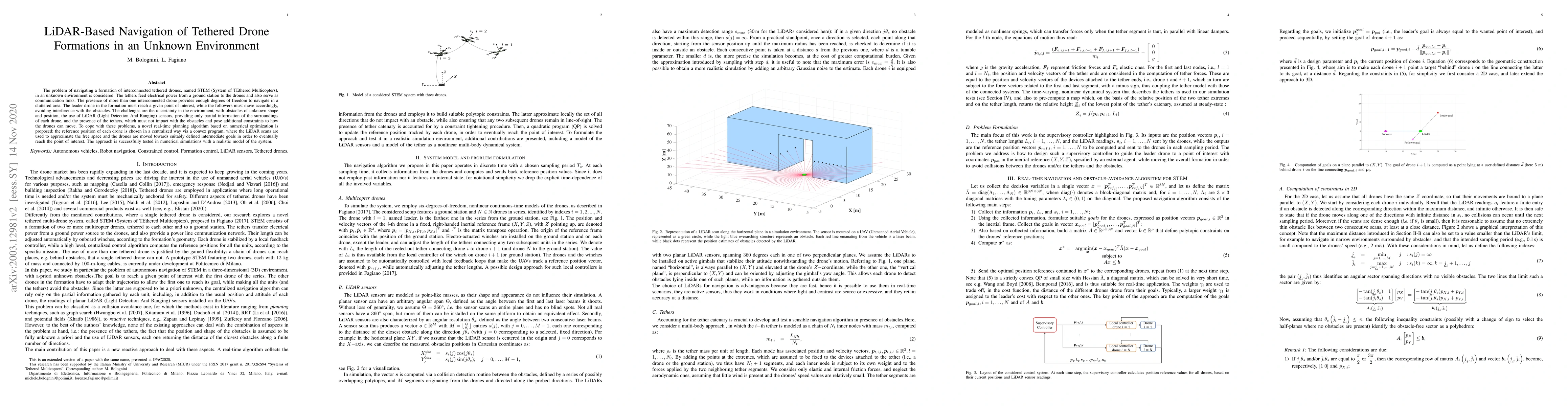 The problem of navigating a formation of interconnected tethered drones, named STEM (System of TEthered Multicopters), in an unknown environment is considered. The tethers feed electrical power from a ground station to the drones and also serve as communication links. The presence of more than one interconnected drone provides enough degrees of freedom to navigate in a cluttered area. The leader drone in the formation must reach a given point of interest, while the followers must move accordingly, avoiding interference with the obstacles. The challenges are the uncertainty in the environment, with obstacles of unknown shape and position, the use of LiDAR (Light Detection And Ranging) sensors, providing only partial information of the surroundings of each drone, and the presence of the tethers, which must not impact with the obstacles and pose additional constraints to how the drones can move. To cope with these problems, a novel real-time planning algorithm based on numerical optimization is proposed: the reference position of each drone is chosen in a centralized way via a convex program, where the LiDAR scans are used to approximate the free space and the drones are moved towards suitably defined intermediate goals in order to eventually reach the point of interest. The approach is successfully tested in numerical simulations with a realistic model of the system.