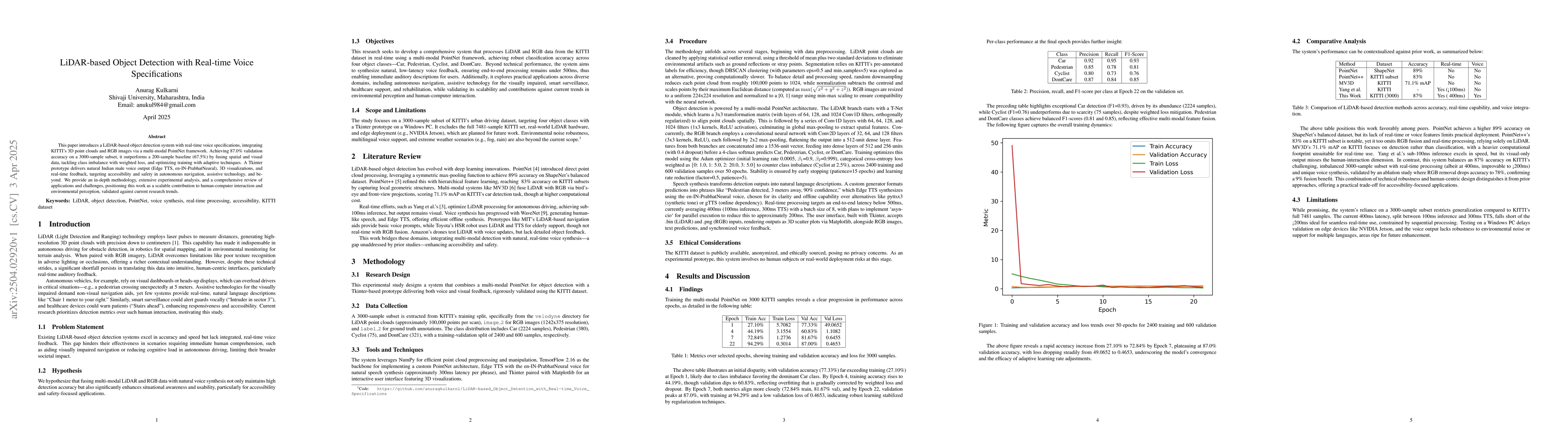 This paper presents a LiDAR-based object detection system with real-time voice specifications, integrating KITTI's 3D point clouds and RGB images through a multi-modal PointNet framework. It achieves 87.0% validation accuracy on a 3000-sample subset, surpassing a 200-sample baseline of 67.5% by combining spatial and visual data, addressing class imbalance with weighted loss, and refining training via adaptive techniques. A Tkinter prototype provides natural Indian male voice output using Edge TTS (en-IN-PrabhatNeural), alongside 3D visualizations and real-time feedback, enhancing accessibility and safety in autonomous navigation, assistive technology, and beyond. The study offers a detailed methodology, comprehensive experimental analysis, and a broad review of applications and challenges, establishing this work as a scalable advancement in human-computer interaction and environmental perception, aligned with current research trends.