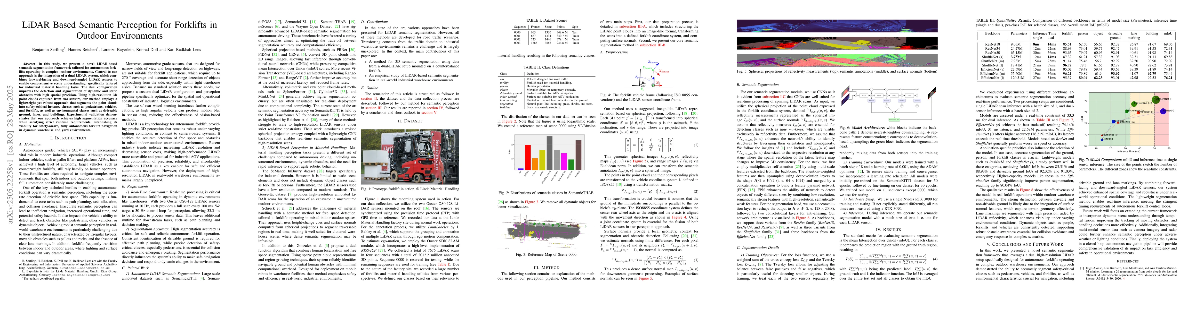 The novelty lies in the specific adaptation of the LiDAR-based semantic perception for forklifts, focusing on safety-critical classes and outdoor environments, which distinguishes it from more general autonomous vehicle segmentation approaches.