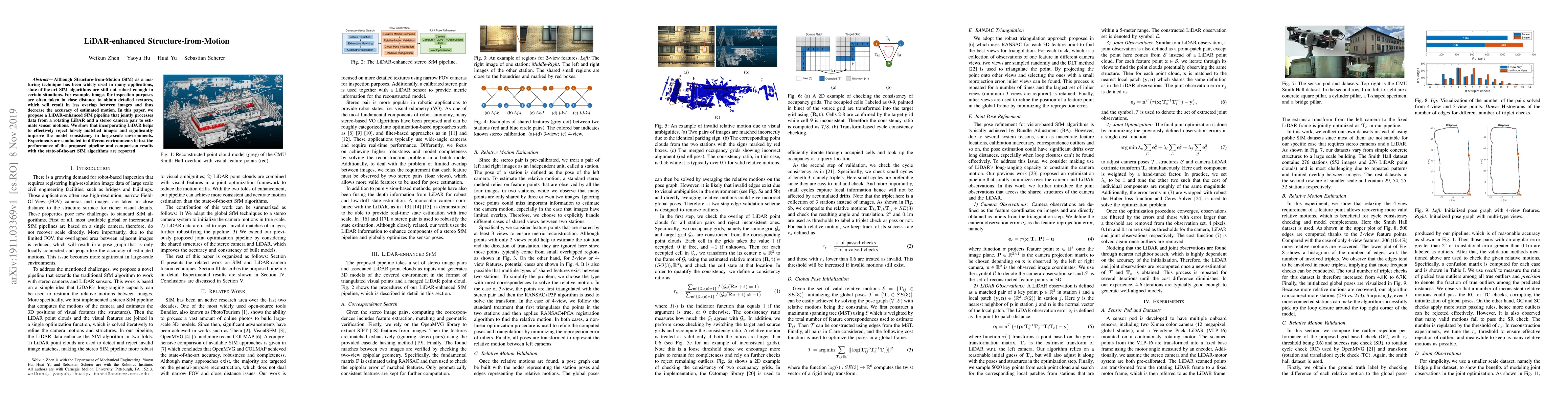 Although Structure-from-Motion (SfM) as a maturing technique has been widely used in many applications, state-of-the-art SfM algorithms are still not robust enough in certain situations. For example, images for inspection purposes are often taken in close distance to obtain detailed textures, which will result in less overlap between images and thus decrease the accuracy of estimated motion. In this paper, we propose a LiDAR-enhanced SfM pipeline that jointly processes data from a rotating LiDAR and a stereo camera pair to estimate sensor motions. We show that incorporating LiDAR helps to effectively reject falsely matched images and significantly improve the model consistency in large-scale environments. Experiments are conducted in different environments to test the performance of the proposed pipeline and comparison results with the state-of-the-art SfM algorithms are reported.