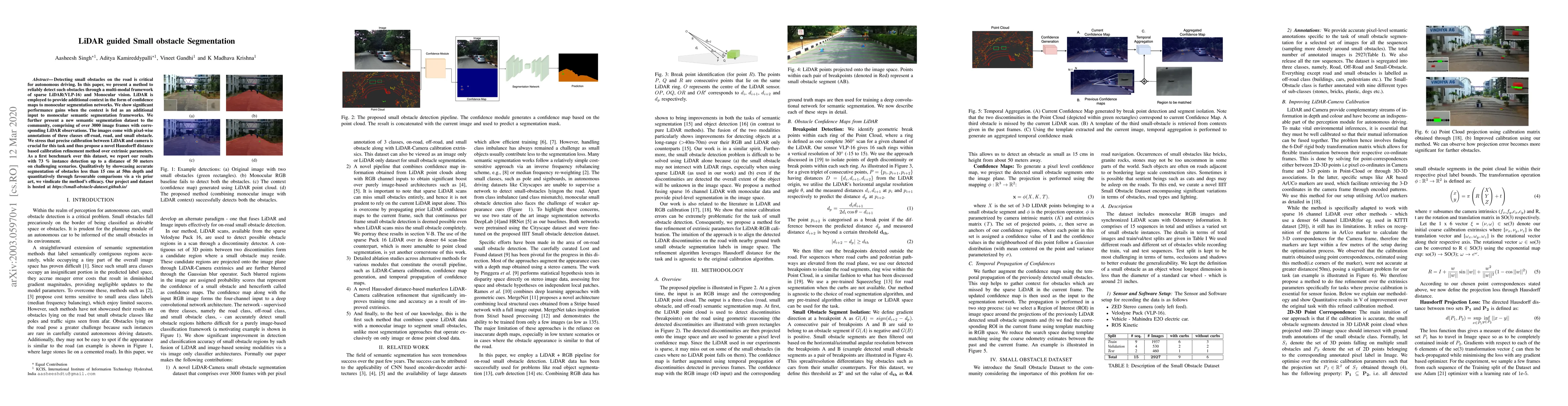Detecting small obstacles on the road is critical for autonomous driving. In this paper, we present a method to reliably detect such obstacles through a multi-modal framework of sparse LiDAR(VLP-16) and Monocular vision. LiDAR is employed to provide additional context in the form of confidence maps to monocular segmentation networks. We show significant performance gains when the context is fed as an additional input to monocular semantic segmentation frameworks. We further present a new semantic segmentation dataset to the community, comprising of over 3000 image frames with corresponding LiDAR observations. The images come with pixel-wise annotations of three classes off-road, road, and small obstacle. We stress that precise calibration between LiDAR and camera is crucial for this task and thus propose a novel Hausdorff distance based calibration refinement method over extrinsic parameters. As a first benchmark over this dataset, we report our results with 73% instance detection up to a distance of 50 meters on challenging scenarios. Qualitatively by showcasing accurate segmentation of obstacles less than 15 cms at 50m depth and quantitatively through favourable comparisons vis a vis prior art, we vindicate the method's efficacy. Our project-page and Dataset is hosted at https://small-obstacle-dataset.github.io/