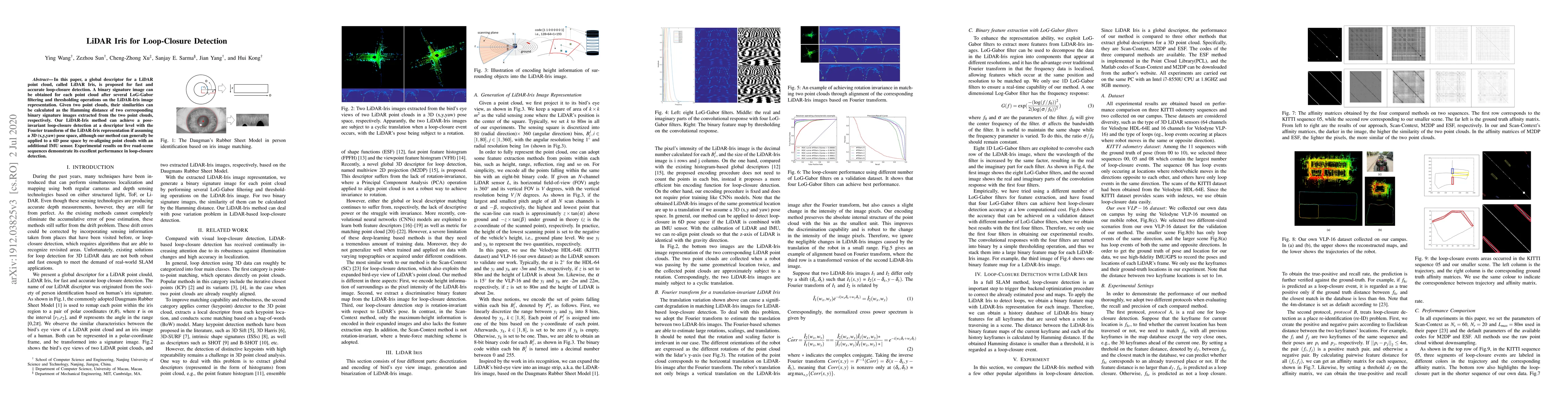 This paper proposes LiDAR Iris, a global descriptor for LiDAR point clouds, for fast and accurate loop-closure detection. The method uses binary signature images derived from LoG-Gabor filtering and thresholding, achieving pose-invariant detection via Fourier transform in a 3D pose space, with potential extension to 6D using IMU sensors.