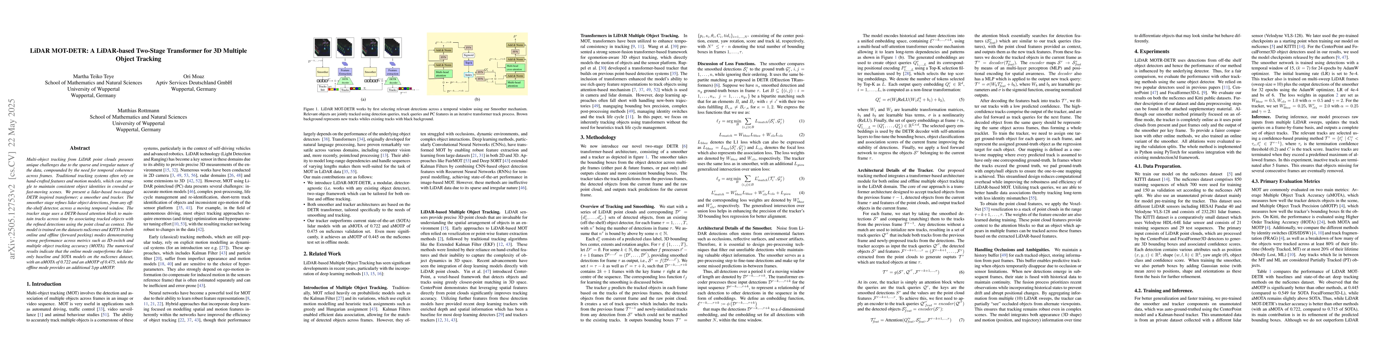 The research presents LiDAR MOT-DETR, a two-stage transformer model for 3D multiple object tracking using LiDAR point clouds. It consists of a smoother stage refining object detections and a tracker stage using DETR-based attention to maintain tracks across frames.