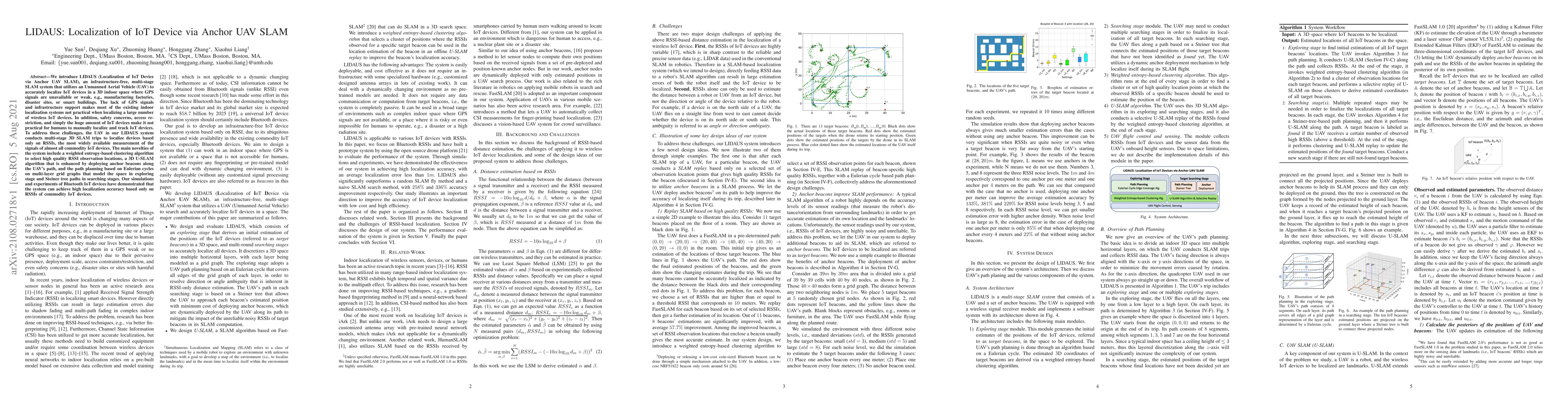This research paper introduces LIDAUS, a system that uses an UAV to accurately localize IoT devices in 3D indoor spaces without GPS or infrastructure support. It achieves high localization accuracy using RSSI measurements of commodity IoT devices.