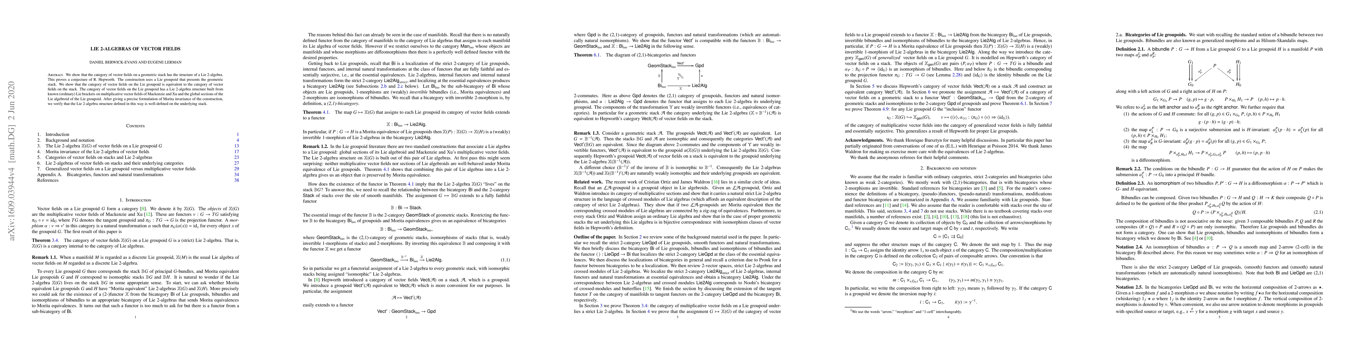 We show that the category of vector fields on a geometric stack has the structure of a Lie 2-algebra. This proves a conjecture of R.~Hepworth. The construction uses a Lie groupoid that presents the geometric stack. We show that the category of vector fields on the Lie groupoid is equivalent to the category of vector fields on the stack. The category of vector fields on the Lie groupoid has a Lie 2-algebra structure built from known (ordinary) Lie brackets on multiplicative vector fields of Mackenzie and Xu and the global sections of the Lie algebroid of the Lie groupoid. After giving a precise formulation of Morita invariance of the construction, we verify that the Lie 2-algebra structure defined in this way is well-defined on the underlying stack.