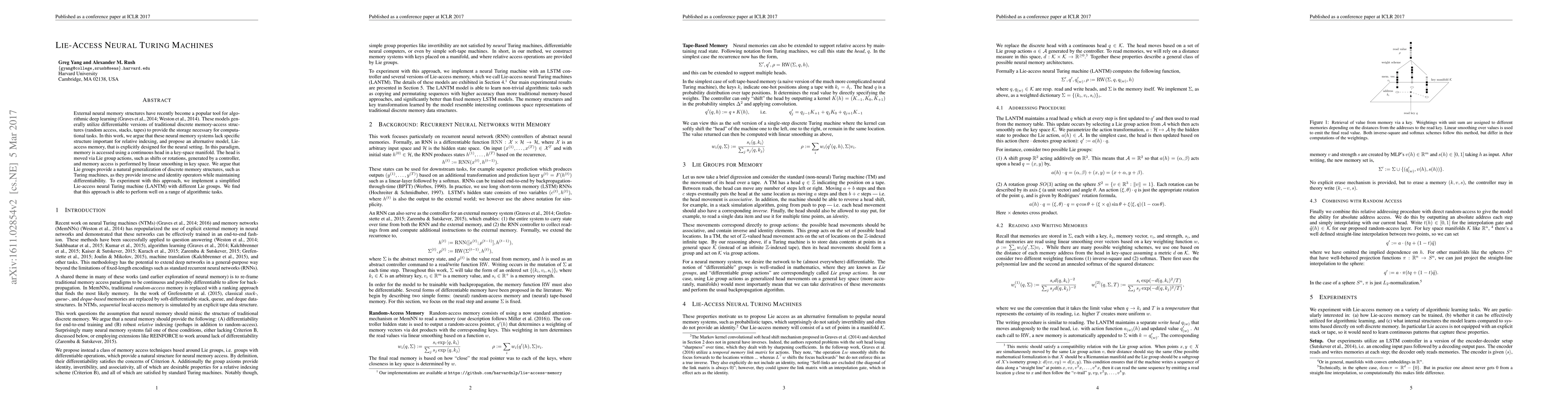 This paper proposes a Lie-access neural Turing machine (LANTM) that uses a continuous head in a key-space manifold for memory access, utilizing Lie group actions for indexing. The authors find that this approach effectively generalizes discrete memory structures and performs well on various algorithmic tasks.