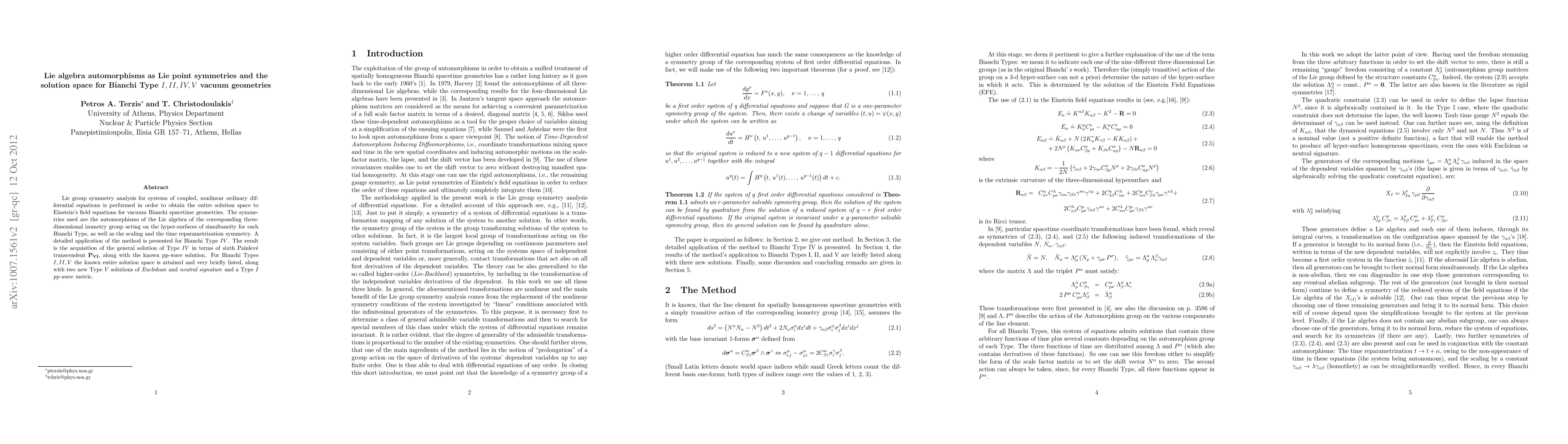 This paper explores the use of Lie algebra automorphisms as Lie point symmetries to determine the full solution space for vacuum Bianchi Type I, II, IV, and V spacetime geometries. The method reveals the general solution for Type IV in terms of the sixth Painlevé transcendent PVI and identifies new solutions for Type V and a Type I pp-wave.