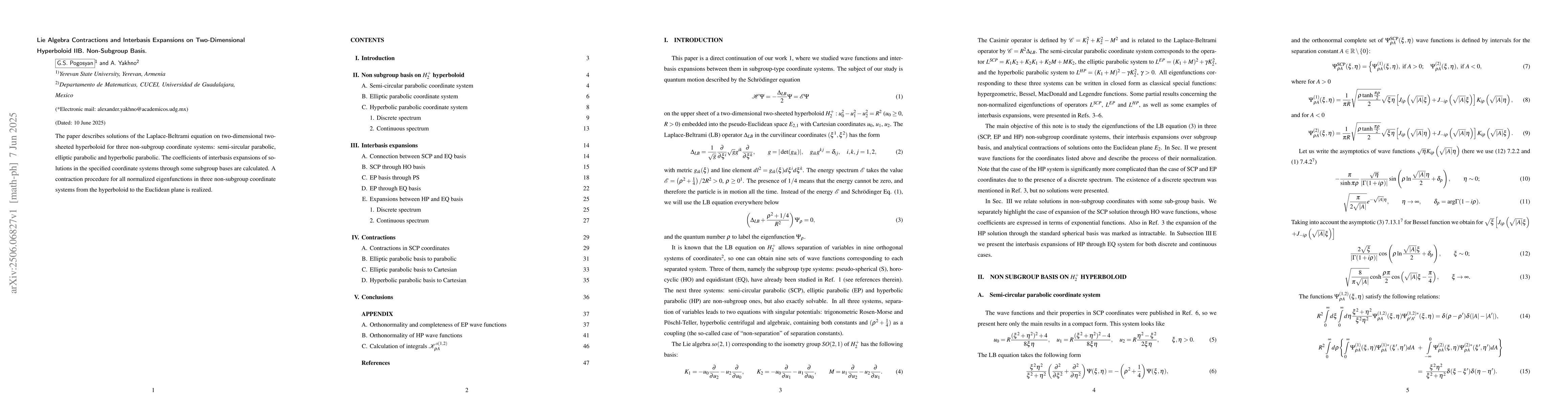 The paper describes solutions of the Laplace-Beltrami equation on two-dimensional two-sheeted hyperboloid for three non-subgroup coordinate systems: semi-sircular parabolic, elliptic parabolic and hyperbolic parabolic. The coefficients of interbasis expansions of solutions in the specified coordinate systems through some subgroup bases are calculated. A contraction procedure for all normalized eigenfunctions in three non-subgroup coordinate systems from the hyperboloid to the Euclidean plane is realized.