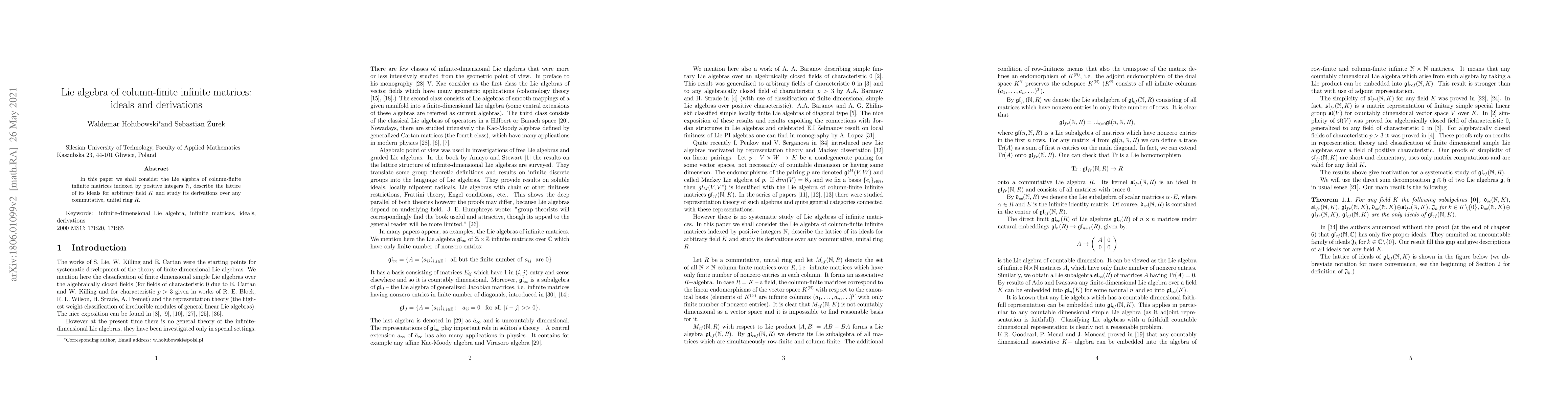 This paper explores the Lie algebra of column-finite infinite matrices, describing their ideals and studying derivations over commutative rings, with implications for understanding algebraic structures in infinite-dimensional spaces.