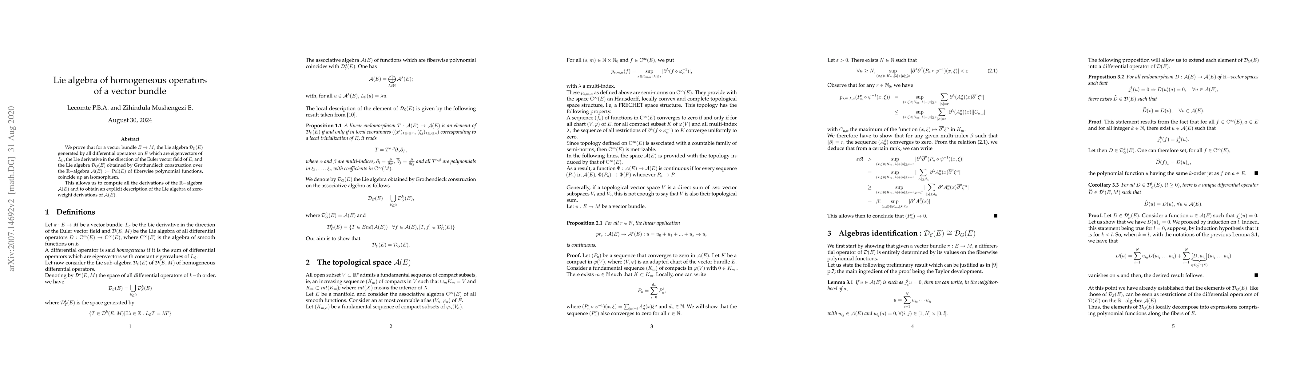 The paper proves that the Lie algebra $\mathcal{D}_{\mathcal{E}}(E)$ of differential operators on a vector bundle $E$ that commute with the Euler vector field and $\mathcal{D}_G(E)$ from Grothendieck construction coincide. This leads to an explicit description of the Lie algebra of zero-weight derivations of the algebra of fiberwise polynomial functions on $E$.