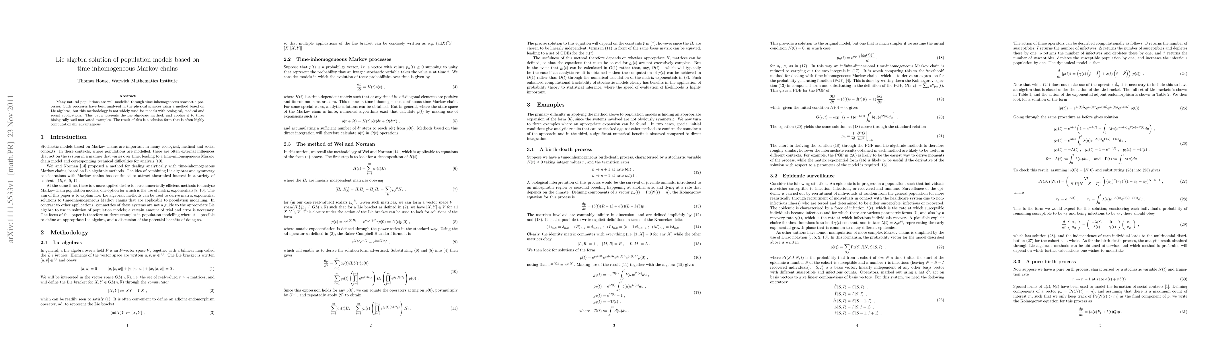 Many natural populations are well modelled through time-inhomogeneous stochastic processes. Such processes have been analysed in the physical sciences using a method based on Lie algebras, but this methodology is not widely used for models with ecological, medical and social applications. This paper presents the Lie algebraic method, and applies it to three biologically well motivated examples. The result of this is a solution form that is often highly computationally advantageous.