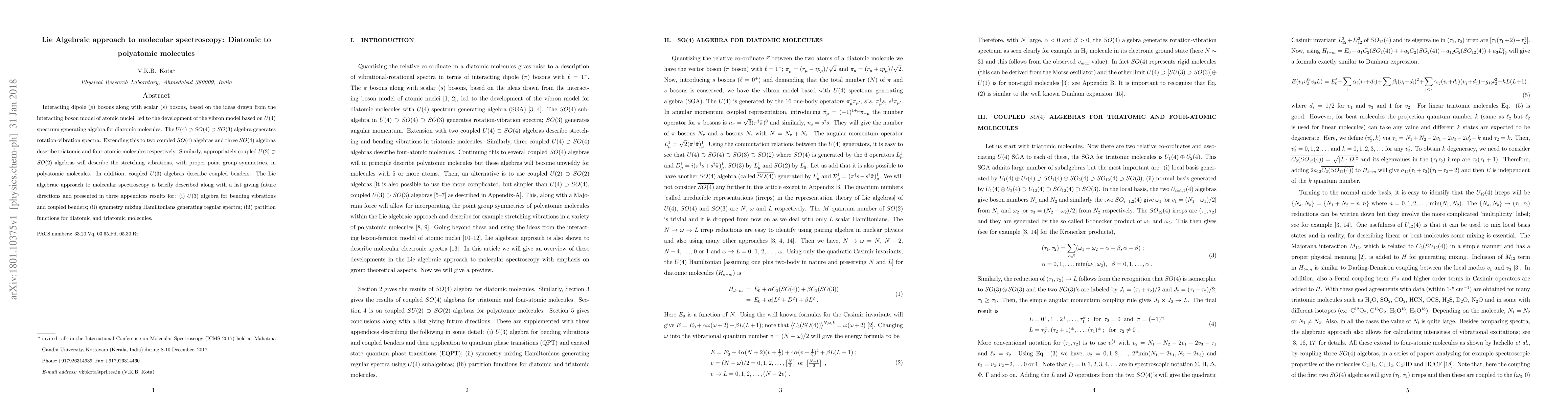 Interacting dipole ($p$) bosons along with scalar ($s$) bosons, based on the ideas drawn from the interacting boson model of atomic nuclei, led to the development of the vibron model based on $U(4)$ spectrum generating algebra for diatomic molecules. The $U(4) \supset SO(4) \supset SO(3)$ algebra generates rotation-vibration spectra. Extending this to two coupled $SO(4)$ algebras and three $SO(4)$ algebras describe triatomic and four-atomic molecules respectively. Similarly, appropriately coupled $U(2) \supset SO(2)$ algebras will describe the stretching vibrations, with proper point group symmetries, in polyatomic molecules. In addition, coupled $U(3)$ algebras describe coupled benders. The Lie algebraic approach to molecular spectroscopy is briefly described along with a list giving future directions and presented in three appendices results for: (i) $U(3)$ algebra for bending vibrations and coupled benders; (ii) symmetry mixing Hamiltonians generating regular spectra; (iii) partition functions for diatomic and triatomic molecules.