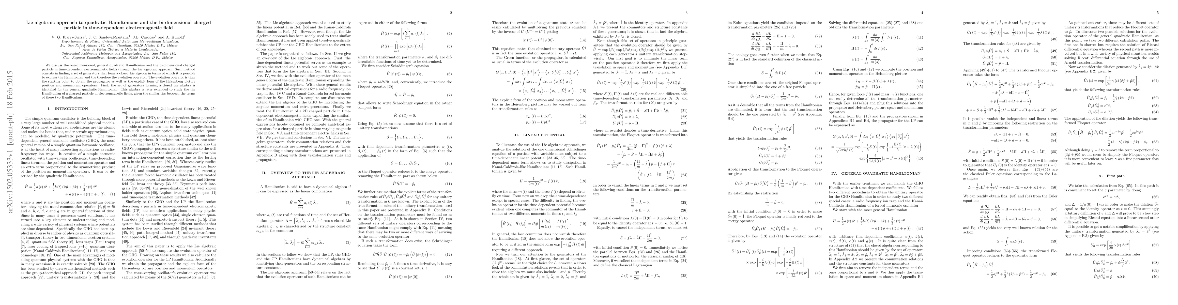 We discuss the one-dimensional, general quadratic Hamiltonian and the bi-dimensional charged particle in time-dependent electromagnetic fields through the Lie algebraic approach. Such method consists in finding a set of generators that form a closed Lie algebra in terms of which it is possible to express the Hamiltonian and the therefore the evolution operator. The evolution operator is then the starting point to obtain the propagator as well as the explicit form of the Heisenberg picture position and momentum operators. First, the set of generators forming a closed Lie algebra is identified for the general quadratic Hamiltonian. This algebra is later extended to study the the Hamiltonian of a charged particle in electromagnetic fields, given the similarities between the terms of these two Hamiltonians.