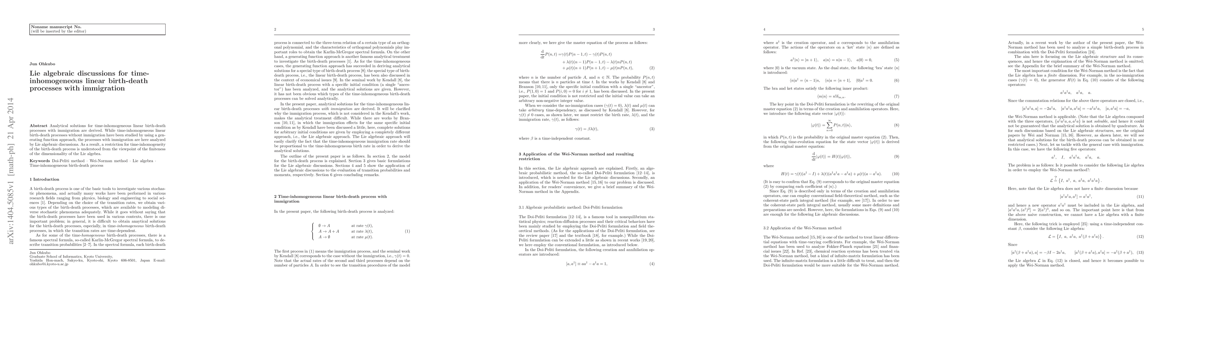 This paper derives analytical solutions for time-inhomogeneous linear birth-death processes with immigration using Lie algebraic methods, contrasting with previous generating function approaches for processes without immigration, and explores the dimensionality constraints of the Lie algebra for time-inhomogeneous processes.
