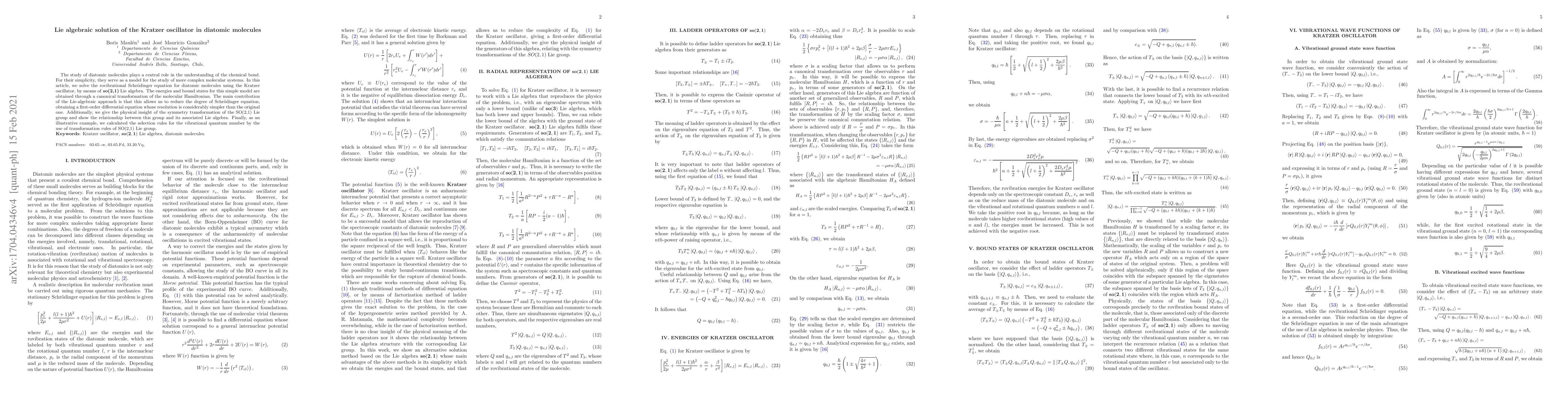 The study of diatomic molecules plays a central role in the understanding of the chemical bond. For their simplicity, they serve as a model for the study of more complex molecular systems. In this article, we solve the rovibrational Schr\"odinger equation for diatomic molecules using the Kratzer oscillator, by means of so(2,1) Lie algebra. The energies and bound states for this simple model are obtained through a canonical transformation of the molecular Hamiltonian. The main contribution of the Lie-algebraic approach is that this allows us to reduce the degree of Schr\"odinger equation, obtaining a first-order differential equation whose resolution is considerably simpler than the original one. Additionally, we give the physical insight of the symmetry transformation of the SO(2,1) Lie group and show the relationship between this group and its associated Lie algebra. Finally, as an illustrative example, we calculated the selection rules for the vibrational quantum number by the use of transformation rules of SO(2,1) Lie group.