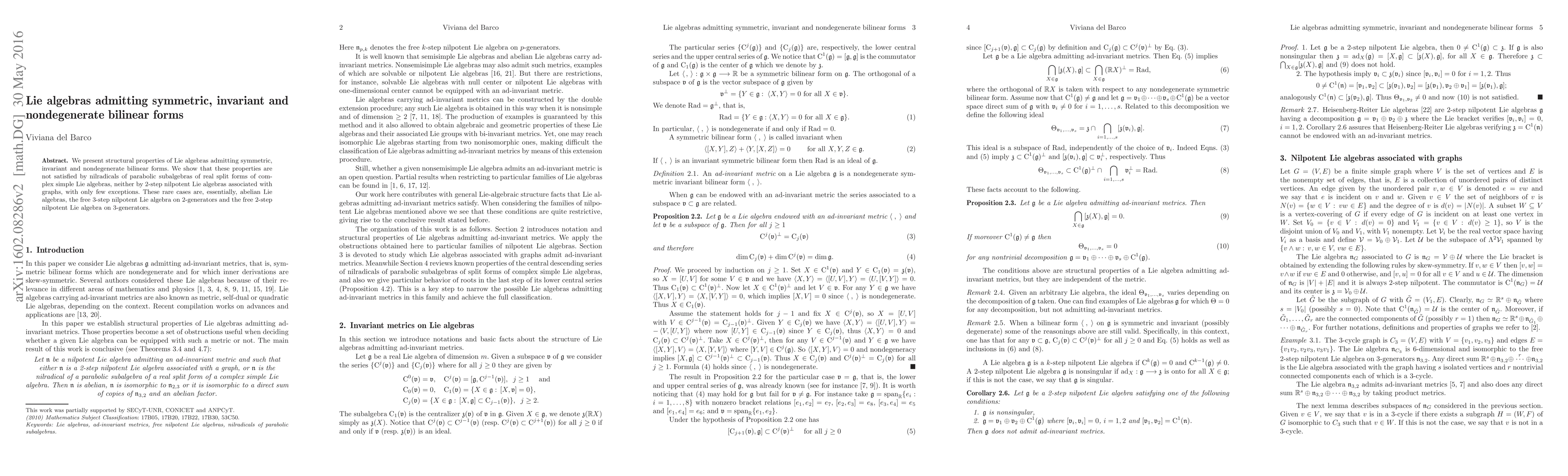 We present structural properties of Lie algebras admitting symmetric, invariant and nondegenerate bilinear forms. We show that these properties are not satisfied by nilradicals of parabolic subalgebras of real split forms of complex simple Lie algebras, neither by 2-step nilpotent Lie algebras associated with graphs, with only few exceptions. These rare cases are, essentially, abelian Lie algebras, the free 3-step nilpotent Lie algebra on 2-generators and the free 2-step nilpotent Lie algebra on 3-generators.