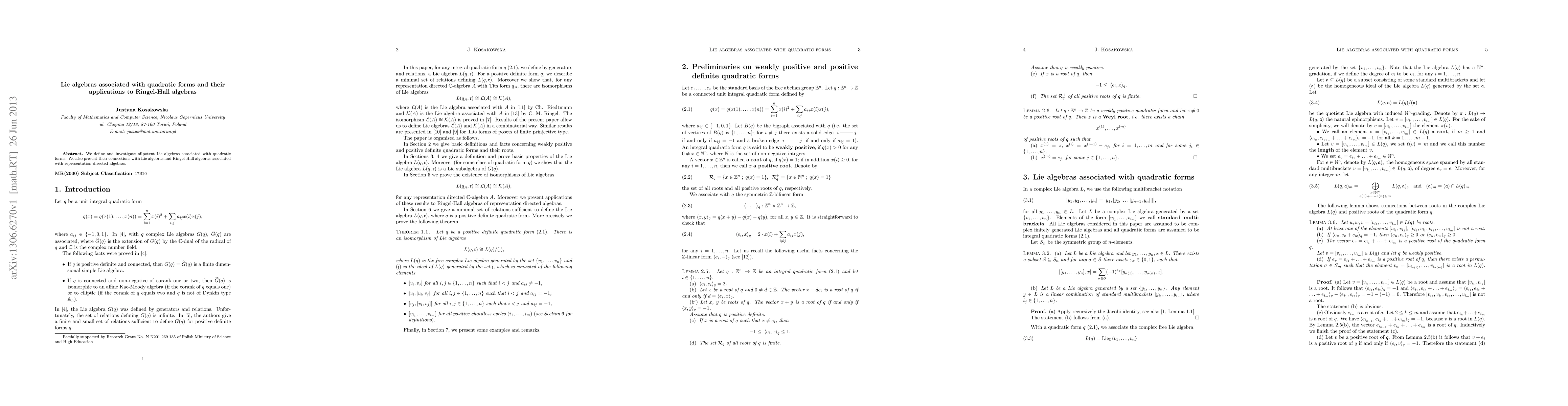 Two-line summary: This paper defines nilpotent Lie algebras linked to quadratic forms and explores their connections to Lie algebras and Ringel-Hall algebras, particularly in relation to representation directed algebras, providing insights into their applications.