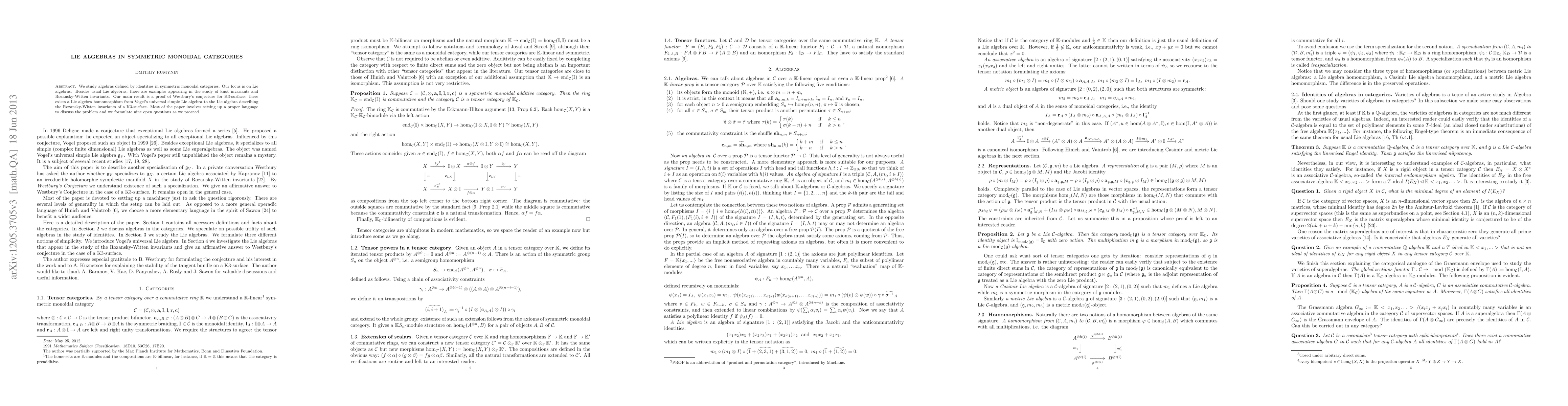 We study algebras defined by identities in symmetric monoidal categories. Our focus is on Lie algebras. Besides usual Lie algebras, there are examples appearing in the study of knot invariants and Rozansky-Witten invariants. Our main result is a proof of Westbury's conjecture for K3-surface: there exists a Lie algebra homomorphism from Vogel's universal simple Lie algebra to the Lie algebra describing the Rozansky-Witten invariants of a K3-surface. Most of the paper involves setting up a proper language to discuss the problem and we formulate nine open questions as we proceed.