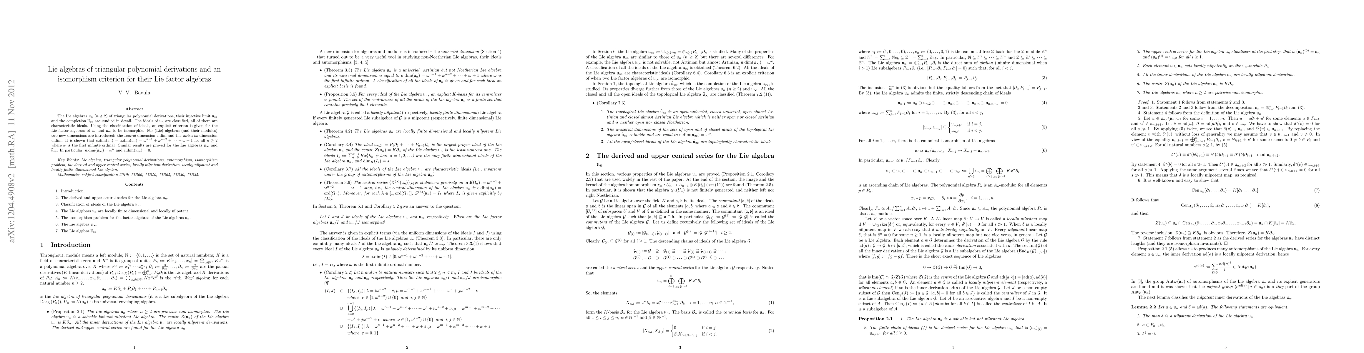 This paper classifies the ideals of Lie algebras derived from unitriangular polynomial derivations and provides an isomorphism criterion for their Lie factor algebras.