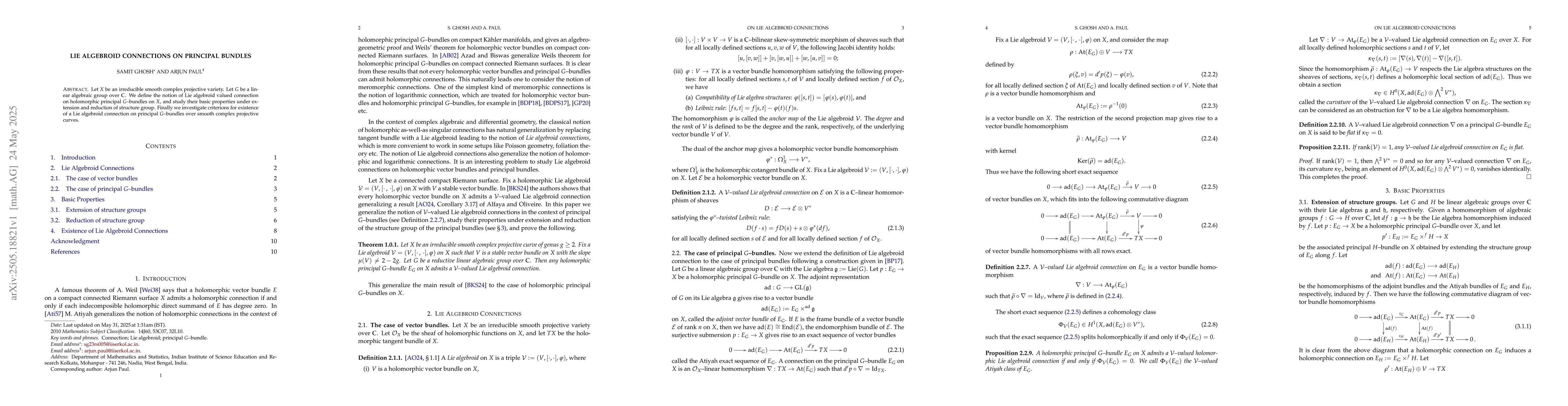 The research defines Lie algebroid-valued connections on holomorphic principal G-bundles over complex projective varieties X, studying their properties under structure group extension and reduction, with a focus on complex projective curves.