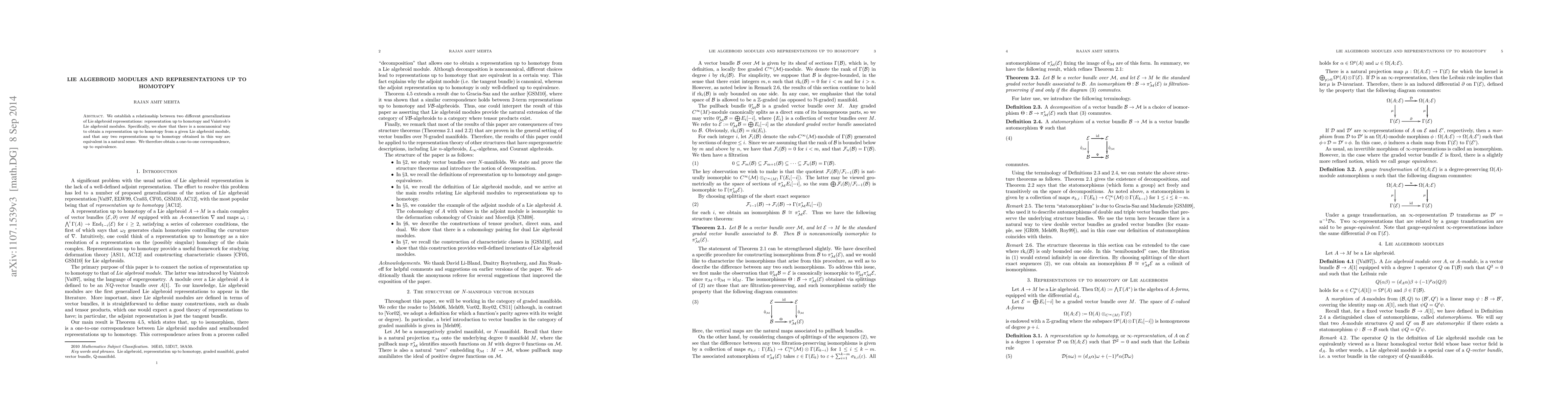 This paper establishes a noncanonical correspondence between Lie algebroid modules and representations up to homotopy, proving that any two representations obtained from a module are equivalent, thus demonstrating a one-to-one relationship up to equivalence.