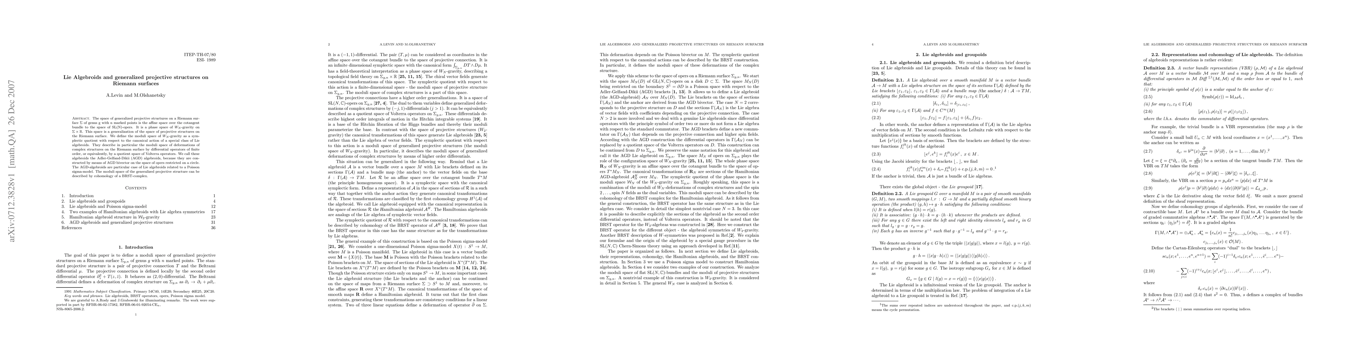 This paper explores the moduli space of generalized projective structures on Riemann surfaces using Lie algebroids and defines the moduli space of $W_N$-gravity as a symplectic quotient. It introduces the Adler-Gelfand-Dikii (AGD) algebroids, which are a special class of Lie algebroids related to a Poisson sigma-model, and describes the space using cohomology of a BRST-complex.