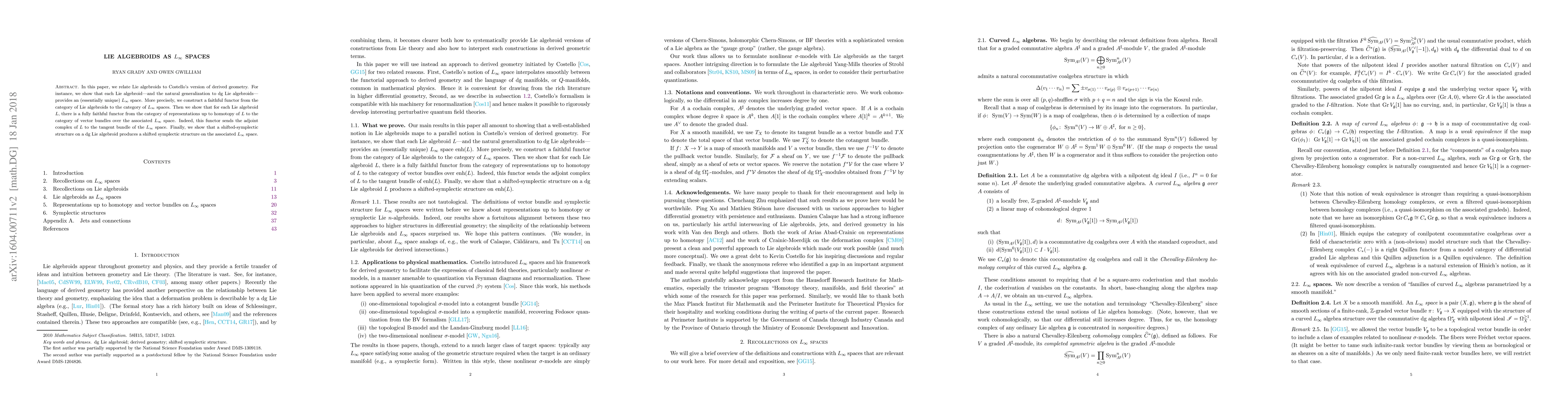 This paper establishes a connection between Lie algebroids and $L_\infty$ spaces, demonstrating that each Lie algebroid corresponds to an $L_\infty$ space via a faithful functor. It also shows that representations of Lie algebroids up to homotopy map to vector bundles over the associated $L_\infty$ space.