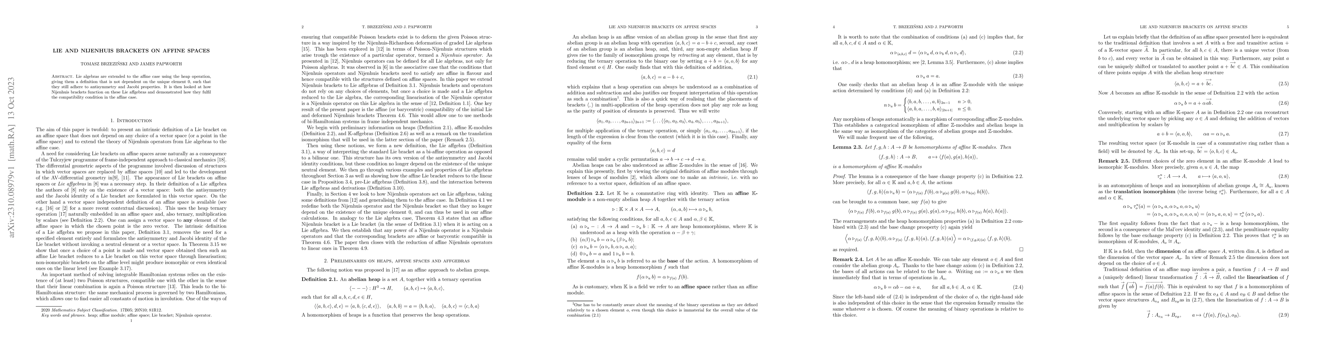 This paper extends Lie algebras to affine spaces using the heap operation, ensuring antisymmetry and the Jacobi identity without reliance on a unique zero element. It also explores Nijenhuis brackets in this context and proves their compatibility conditions in affine settings.