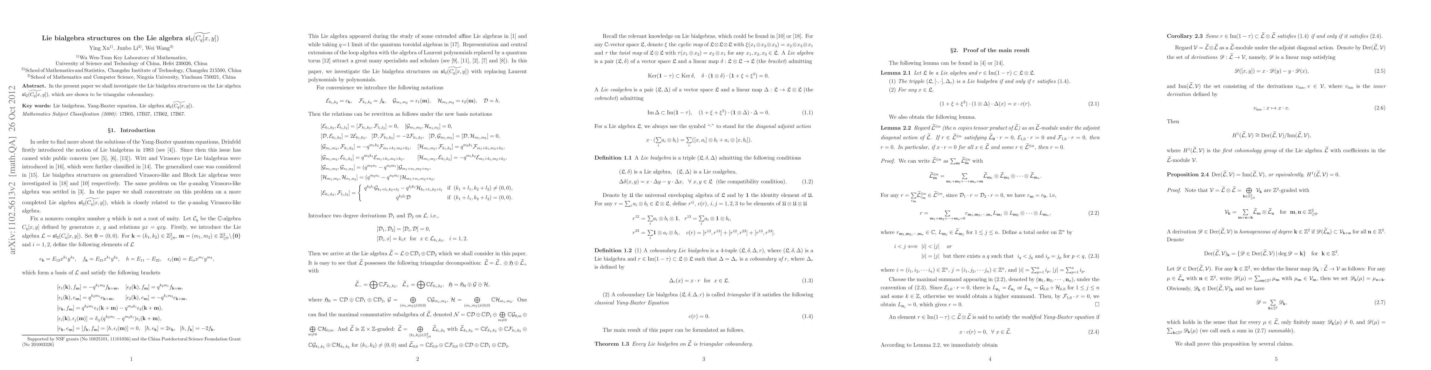 Summary: This paper explores Lie bialgebra structures on the Lie algebra $\widetilde{\frak{sl}_2(C_q[x,y])}$, demonstrating that these structures are triangular coboundary types.