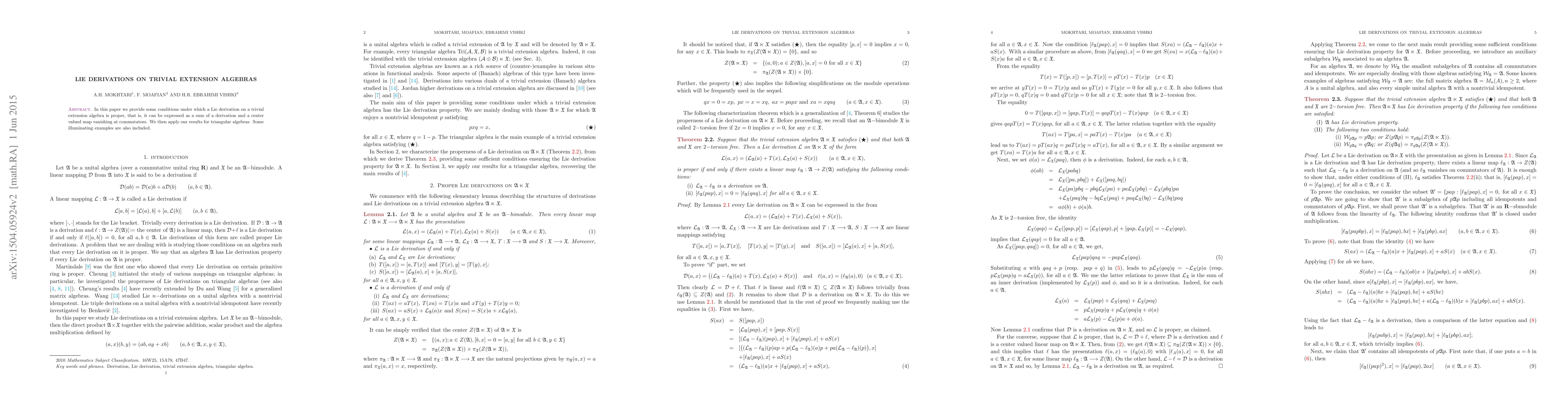 This paper establishes conditions for a Lie derivation on a trivial extension algebra to be proper, decomposing it into a derivation and a center-valued map. It extends existing results on the properness of Lie derivations in triangular algebras and includes illustrative examples.