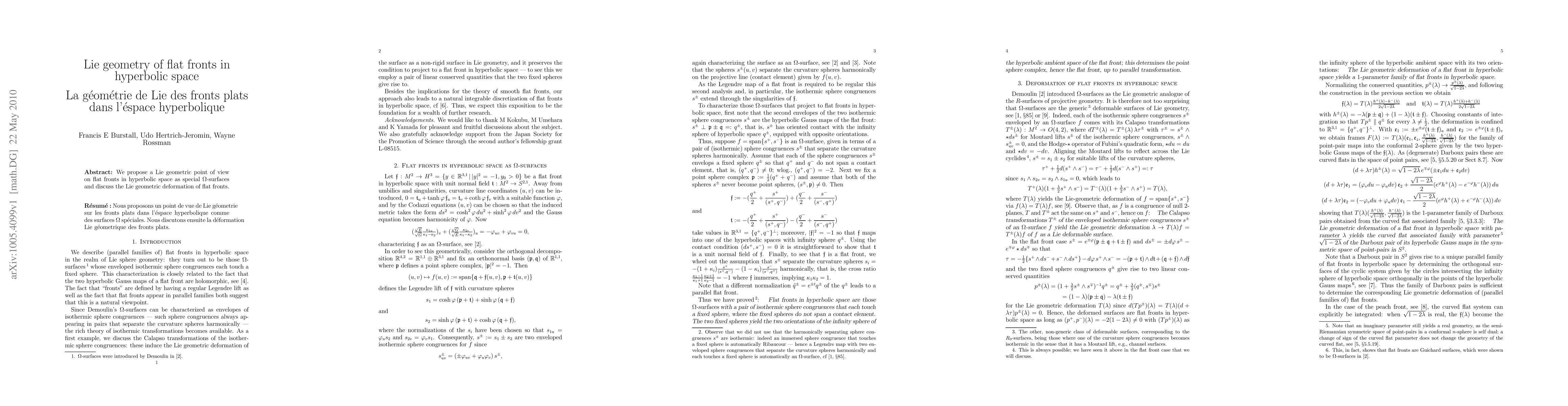 Summary: This paper explores the Lie geometric framework for understanding flat fronts in hyperbolic space, characterizing them as special omega-surfaces and examining their deformations through Lie geometric techniques.