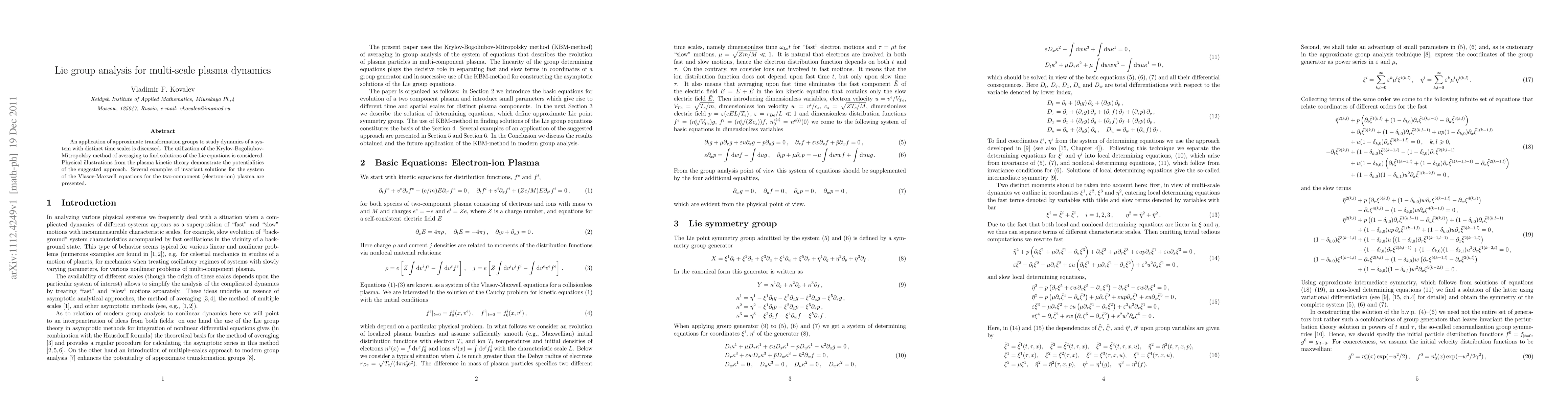 This paper applies Lie group analysis and the Krylov-Bogoliubov-Mitropolsky method to study multi-scale dynamics in plasma systems. It demonstrates the effectiveness of the approach through invariant solutions of the Vlasov-Maxwell equations for electron-ion plasmas.