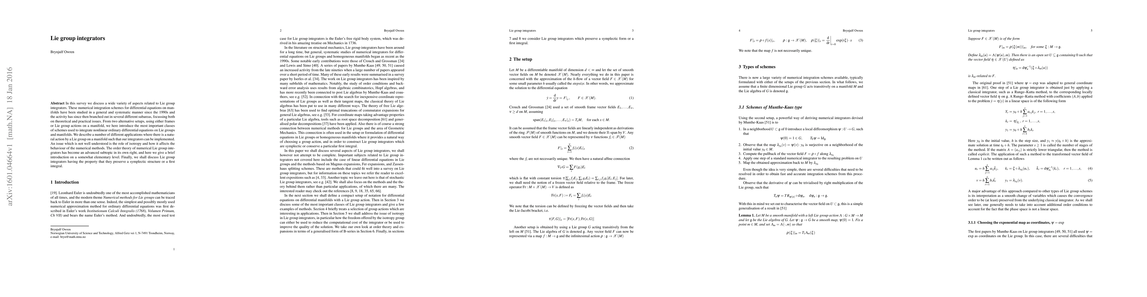 This paper surveys Lie group integrators, numerical methods for solving differential equations on manifolds, highlighting their theoretical and practical aspects, and discussing their applications, the role of isotropy, and their symplectic or integral-preserving properties.