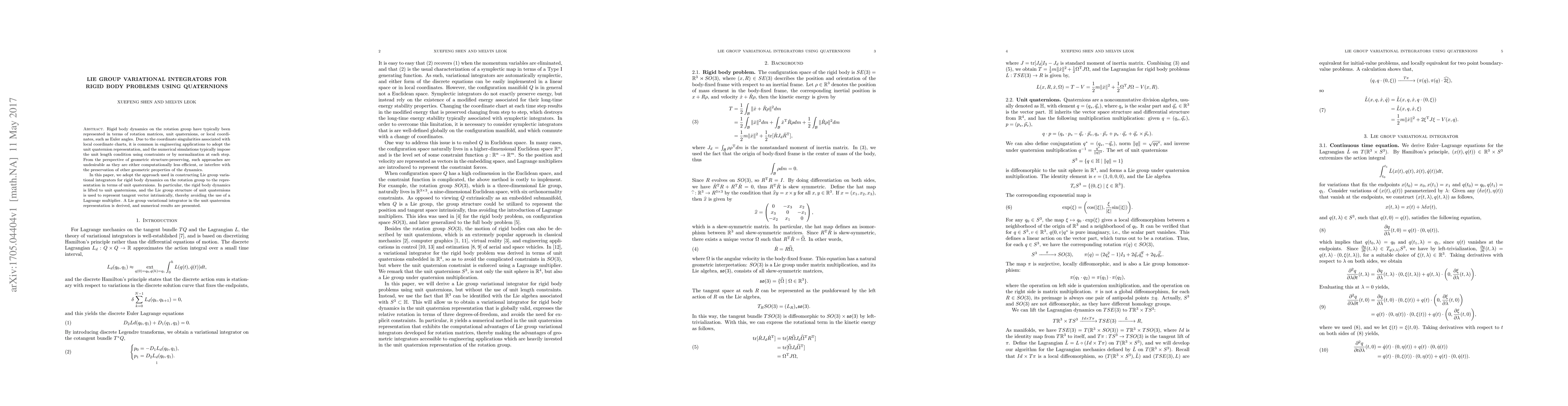 This paper presents a Lie group variational integrator for rigid body dynamics using unit quaternions, leveraging their intrinsic Lie group structure to avoid coordinate singularities and computational inefficiencies. Numerical results demonstrate the effectiveness of this method in preserving geometric properties.