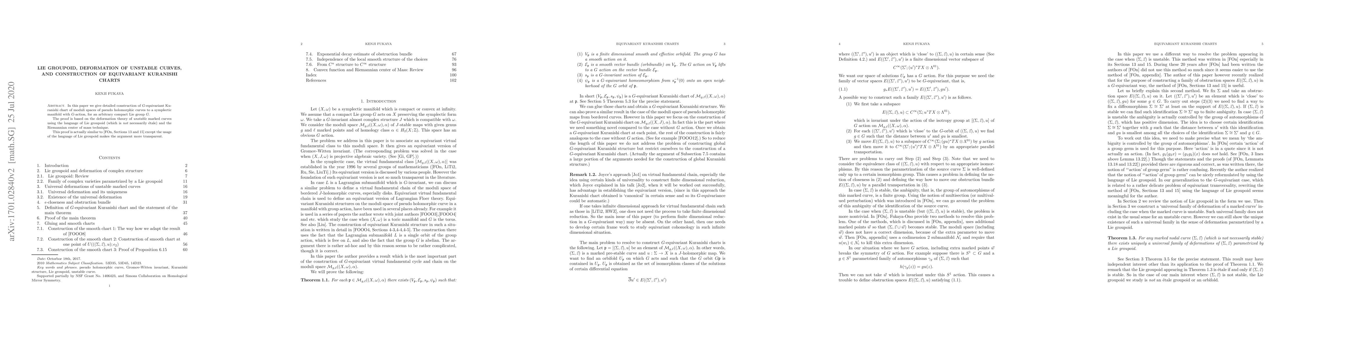 This paper constructs $G$-equivariant Kuranishi charts for moduli spaces of pseudo-holomorphic curves using Lie groupoid deformation theory and Riemannian center of mass techniques. The method clarifies the proof, correcting previous errors and improving transparency.