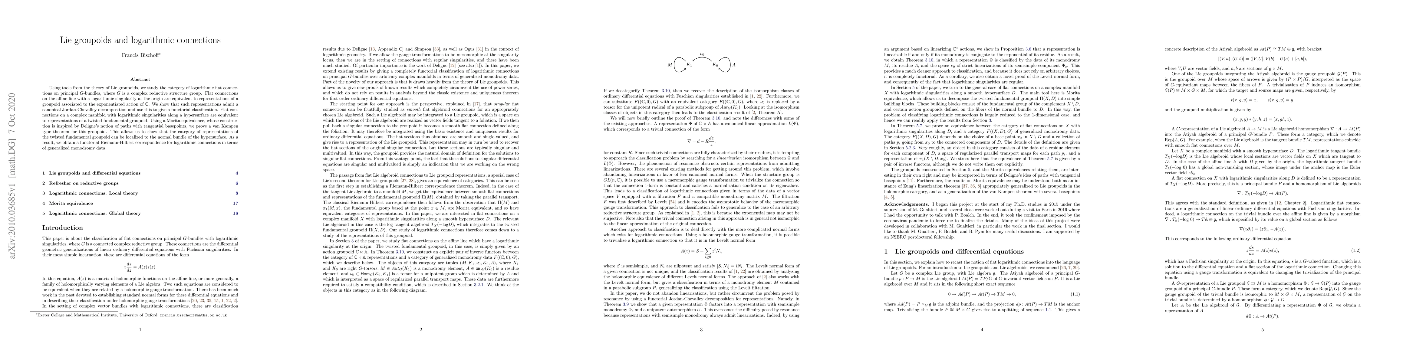 Using tools from the theory of Lie groupoids, we study the category of logarithmic flat connections on principal $G$-bundles, where $G$ is a complex reductive structure group. Flat connections on the affine line with a logarithmic singularity at the origin are equivalent to representations of a groupoid associated to the exponentiated action of $\mathbb{C}$. We show that such representations admit a canonical Jordan-Chevalley decomposition and use this to give a functorial classification. Flat connections on a complex manifold with logarithmic singularities along a hypersurface are equivalent to representations of a twisted fundamental groupoid. Using a Morita equivalence, whose construction is inspired by Deligne's notion of paths with tangential basepoints, we prove a van Kampen type theorem for this groupoid. This allows us to show that the category of representations of the twisted fundamental groupoid can be localized to the normal bundle of the hypersurface. As a result, we obtain a functorial Riemann-Hilbert correspondence for logarithmic connections in terms of generalized monodromy data.