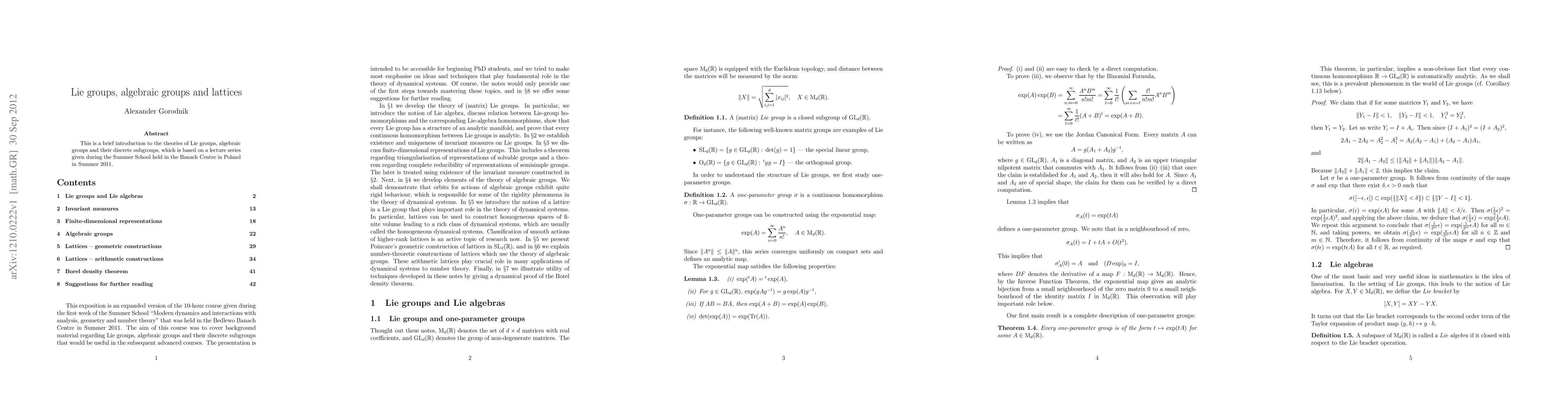 This is a brief introduction to the theories of Lie groups, algebraic groups and their discrete subgroups, which is based on a lecture series given during the Summer School held in the Banach Centre in Poland in Summer 2011.