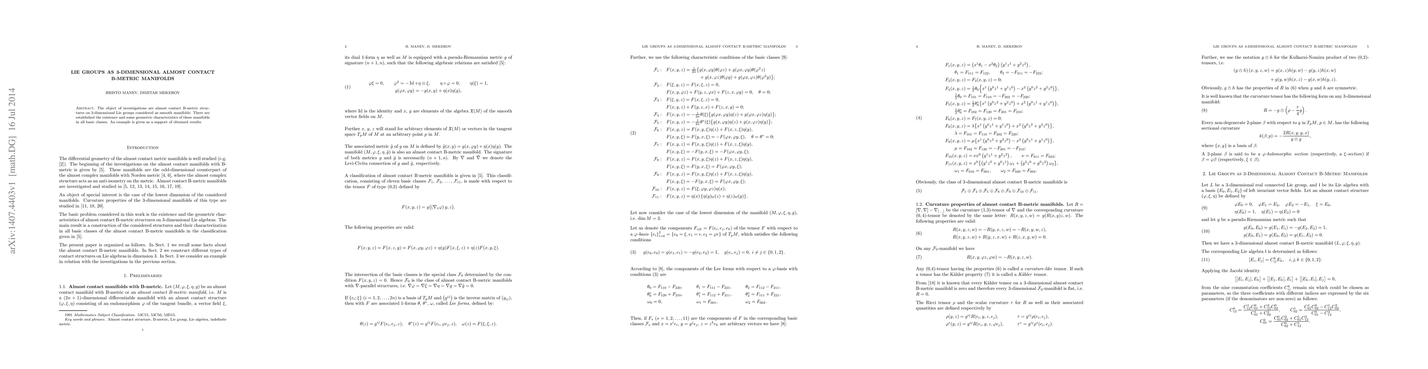The object of investigations are almost contact B-metric structures on 3-dimensional Lie groups considered as smooth manifolds. There are established the existence and some geometric characteristics of these manifolds in all basic classes. An example is given as a support of obtained results.